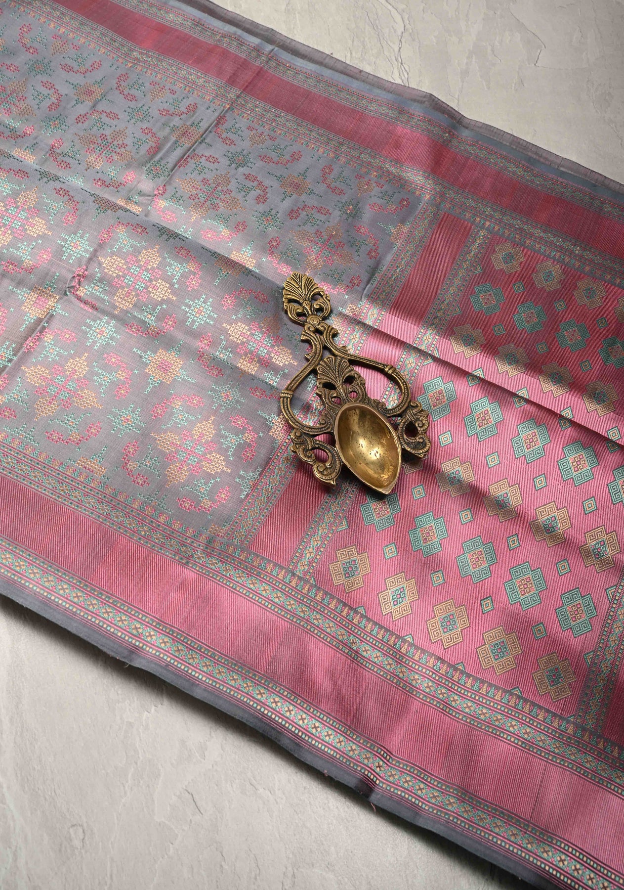The saree features the traditional Tanchoi weaving technique, known for its intricate patterns created without zari. The body is adorned with an elegant brocade design, adding depth and texture while maintaining a refined, matte elegance. The soft grey hue gives it a modern, minimalist appeal—perfect for those who love understated luxury.