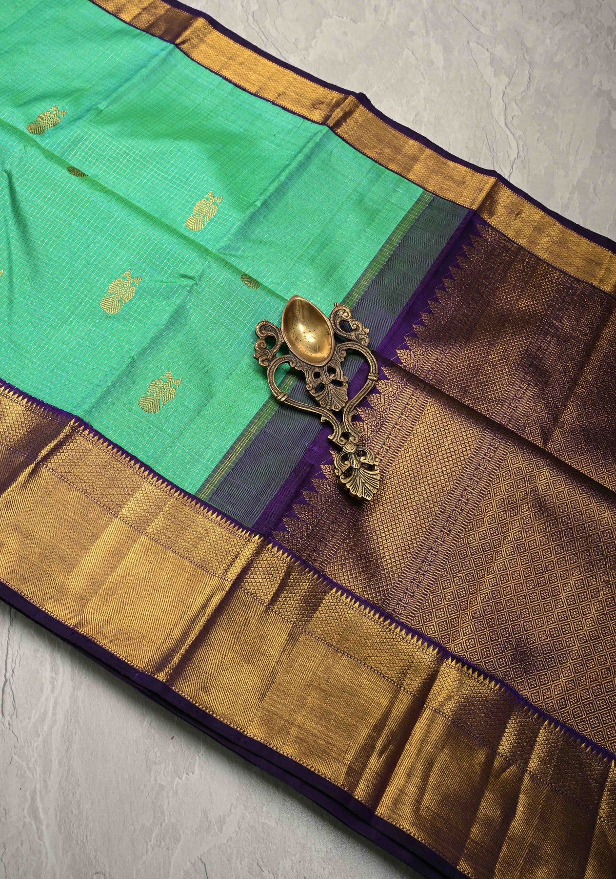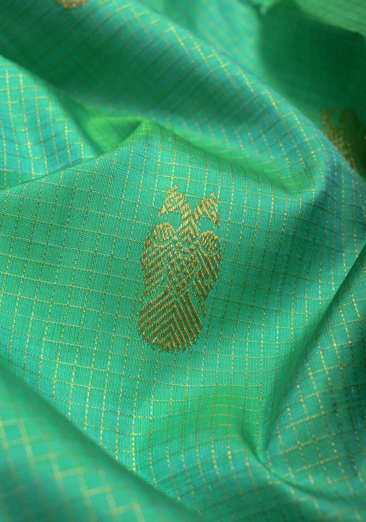 Step into the legacy of timeless craftsmanship with this Green Dual Tone Pure Silk Kanjivaram Saree, showcasing the Heritage Podi Kattam Zari Checks and majestic Gandaberunda Buttas — a symbol of strength and divine power. Woven from the finest silk, this saree radiates a rich dual-tone effect, enhanced by the shimmer of traditional pure zari work. A stunning choice for weddings, temple ceremonies, and cultural celebrations, this masterpiece reflects the grandeur and grace of authentic Kanjivaram heritage