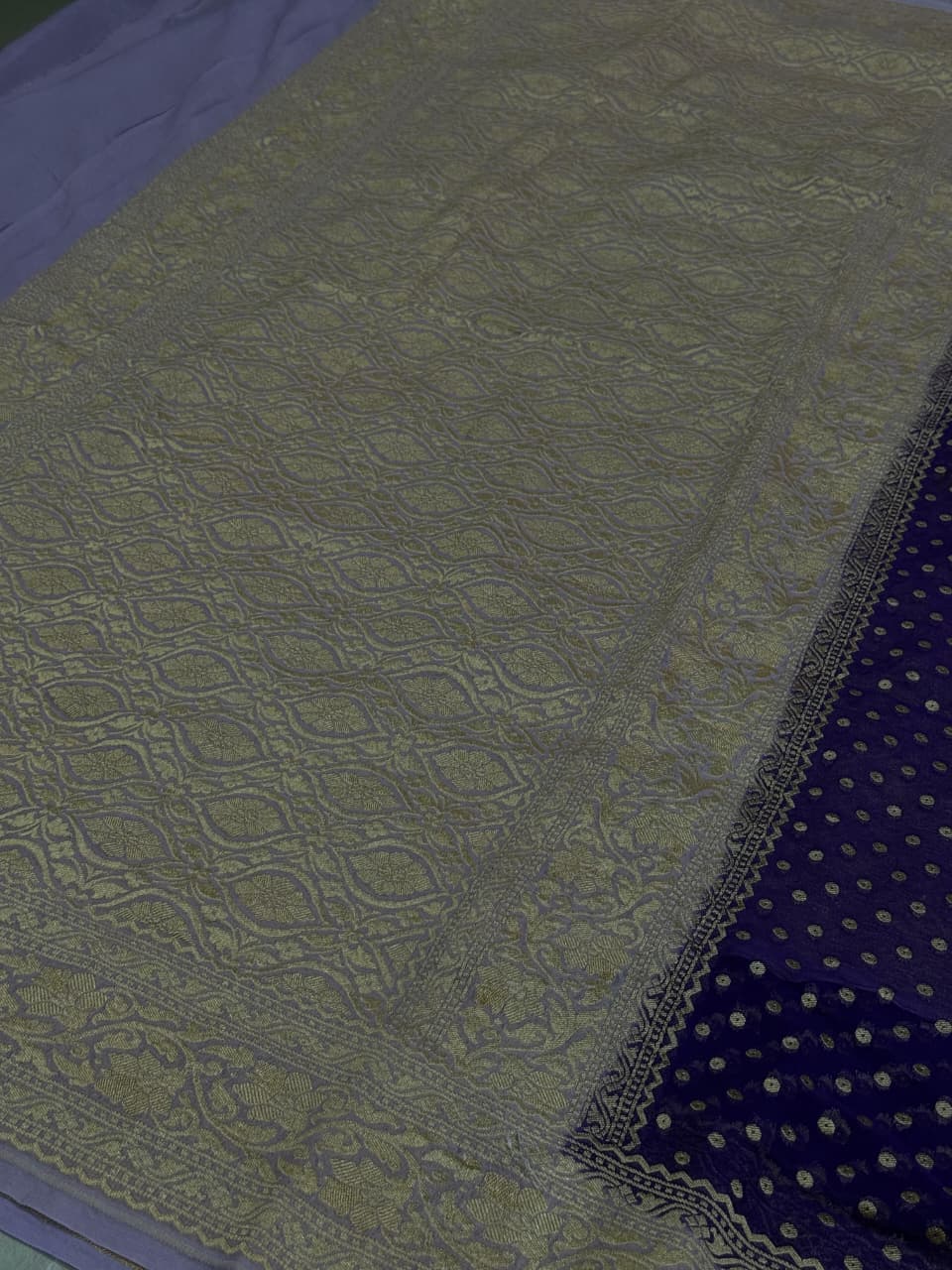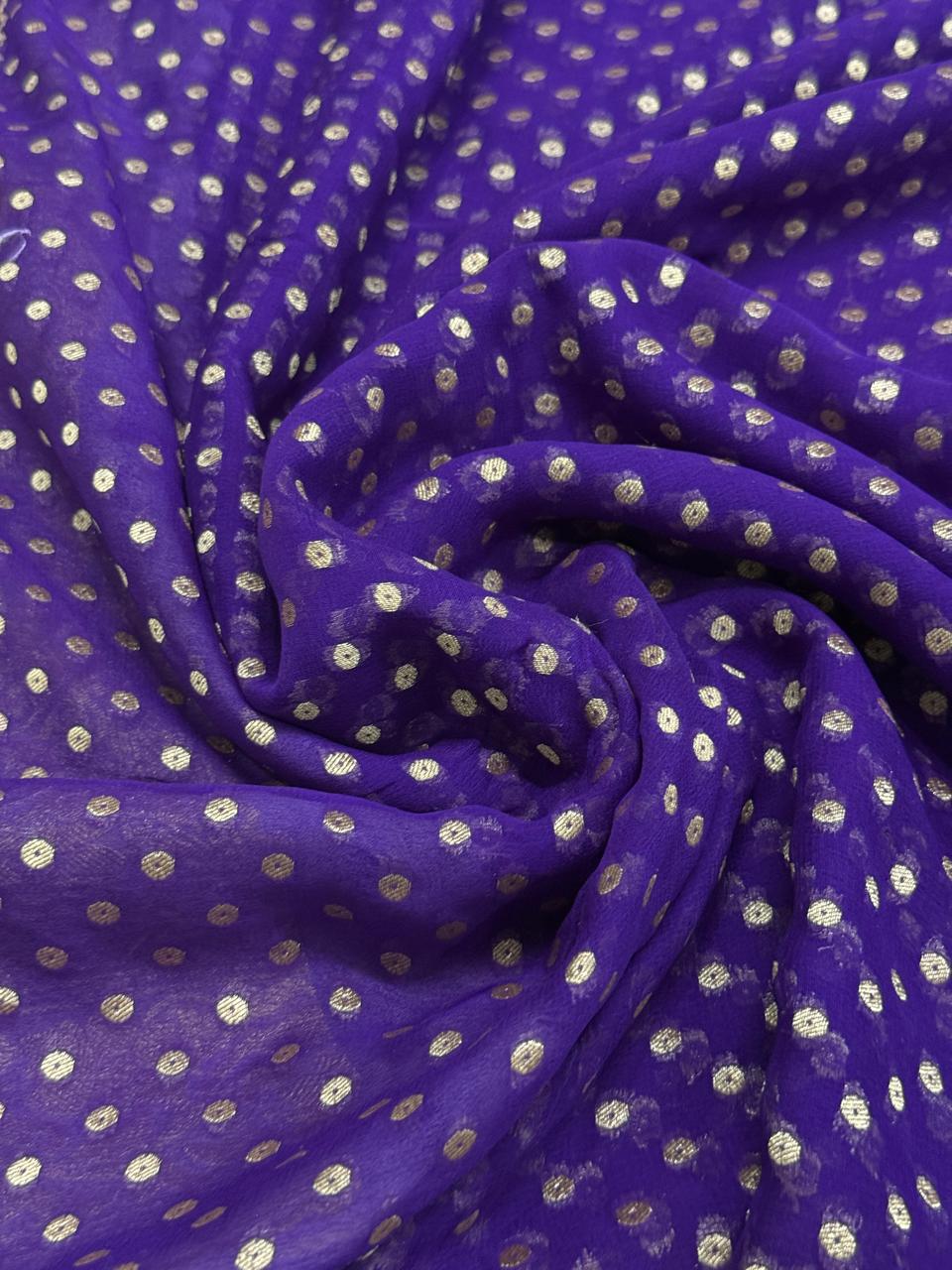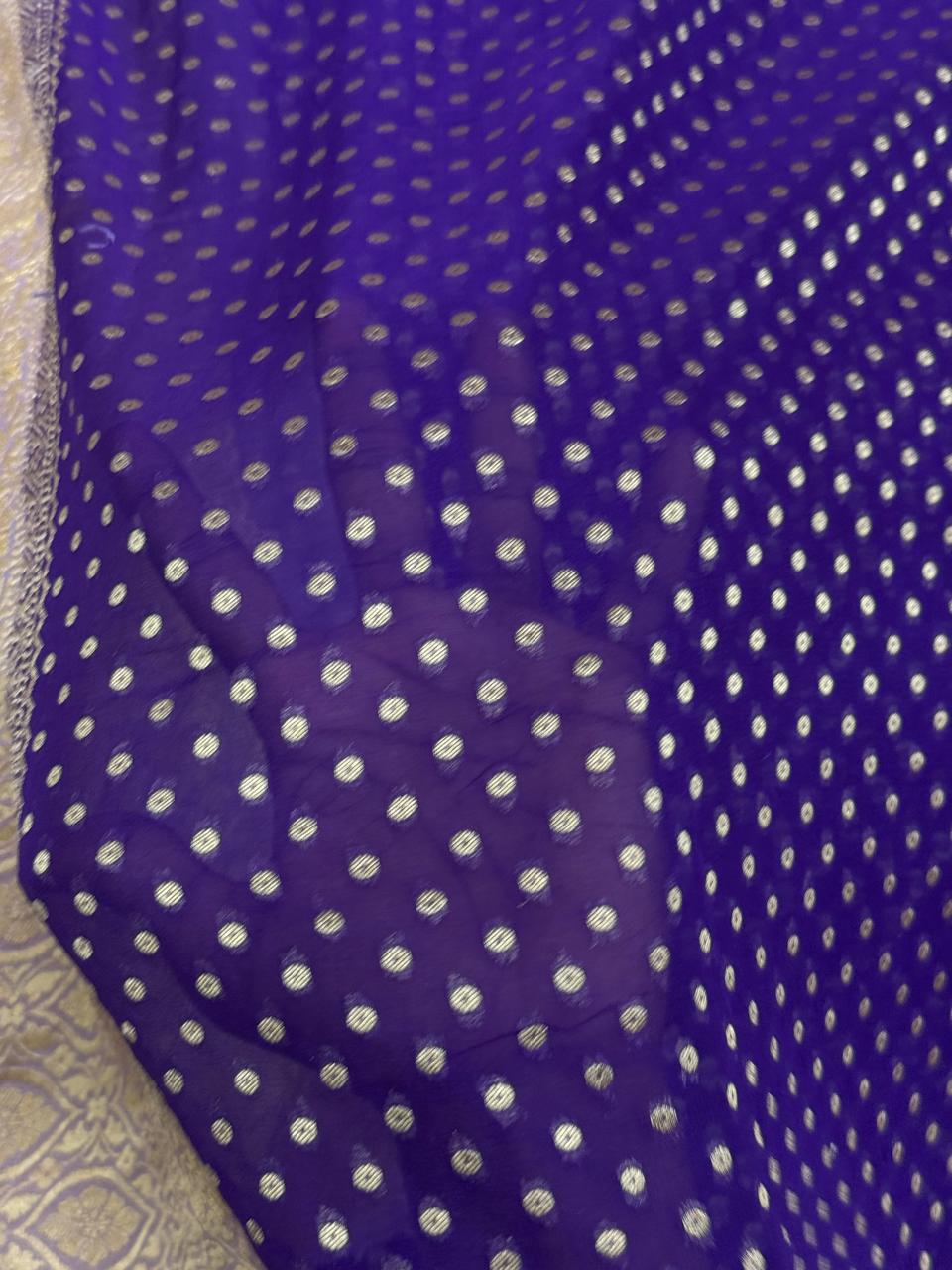This Ink Purple Banarasi Georgette Silk Saree is a stunning expression of classic charm with a playful twist. The ink purple body is adorned with elegant polka dot brocade, blending tradition with a hint of modern flair. Crafted from georgette silk, it offers a soft, flowing drape ideal for all-day wear. The saree is elevated with a striking contrast zari border, intricately woven with traditional Banarasi motifs, adding a touch of grandeur. Perfect for festive occasions, weddings, or elegant evening gatherings, this saree is a statement of refined sophistication.