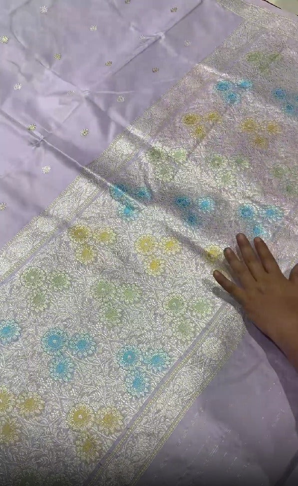 The Kadhuwa Meenakari Skirt Banarasi Pure Katan Silk Saree in Smokey Lavender is a rare blend of heritage craftsmanship and subtle luxury. Woven from the finest pure Katan silk, this saree features the intricate Kadhuwa weave—a labor-intensive technique known for its durability and refined finish. The body is adorned with a rich Jungla Meenakari jaal, showcasing elaborate floral and vine patterns highlighted with multicolored threads that bring the design to life. Accentuated with delicate Sona Rupa Chunri buttis and a shimmering zari border, this saree is a true testament to timeless Banarasi artistry. The soft smokey lavender hue adds an ethereal charm, making it an exquisite choice for weddings, grand celebrations, and heirloom-worthy collections.
