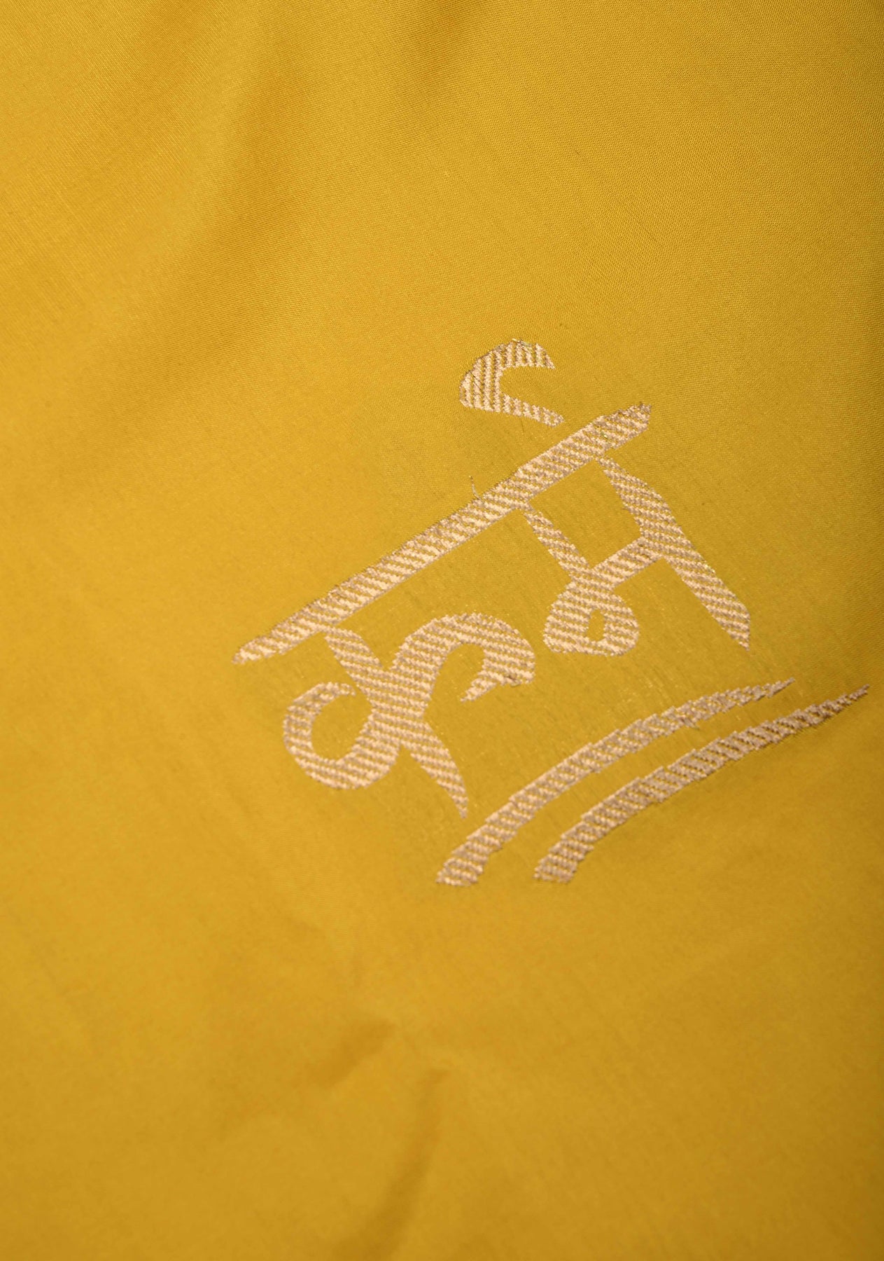Adorned with intricate Karma motifs, symbolizing divine blessings and positive energy, the design reflects artistry and cultural richness. The motifs are meticulously handwoven, adding depth and elegance to the vibrant mustard yellow base.