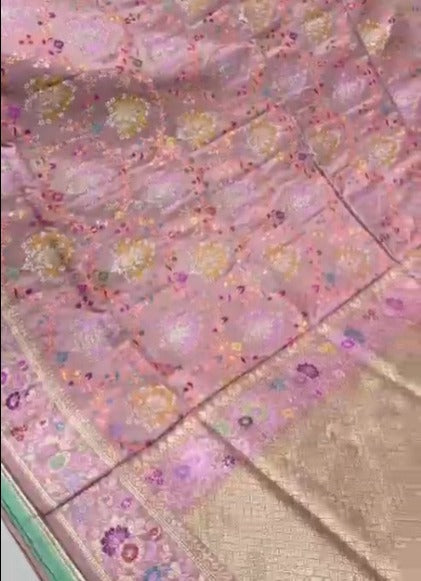 Graceful and ethereal, this Pastel Hued Banarasi Tissue Silk Saree is a celebration of timeless artistry. Handwoven using the meticulous Kadhuwa technique, it features an all-over Floral Meenakari Jungla—a rich interplay of gold, silver, and multicolored threads forming a blooming jungle of motifs. The soft, shimmering tissue silk base adds a translucent glow, making the saree light yet luxurious. A finely framed border lends structure and sophistication to the delicate drape. Perfect for weddings, intimate celebrations, or festive gatherings, this saree is a true heirloom that blends classic Banarasi weaving with soft, contemporary charm.