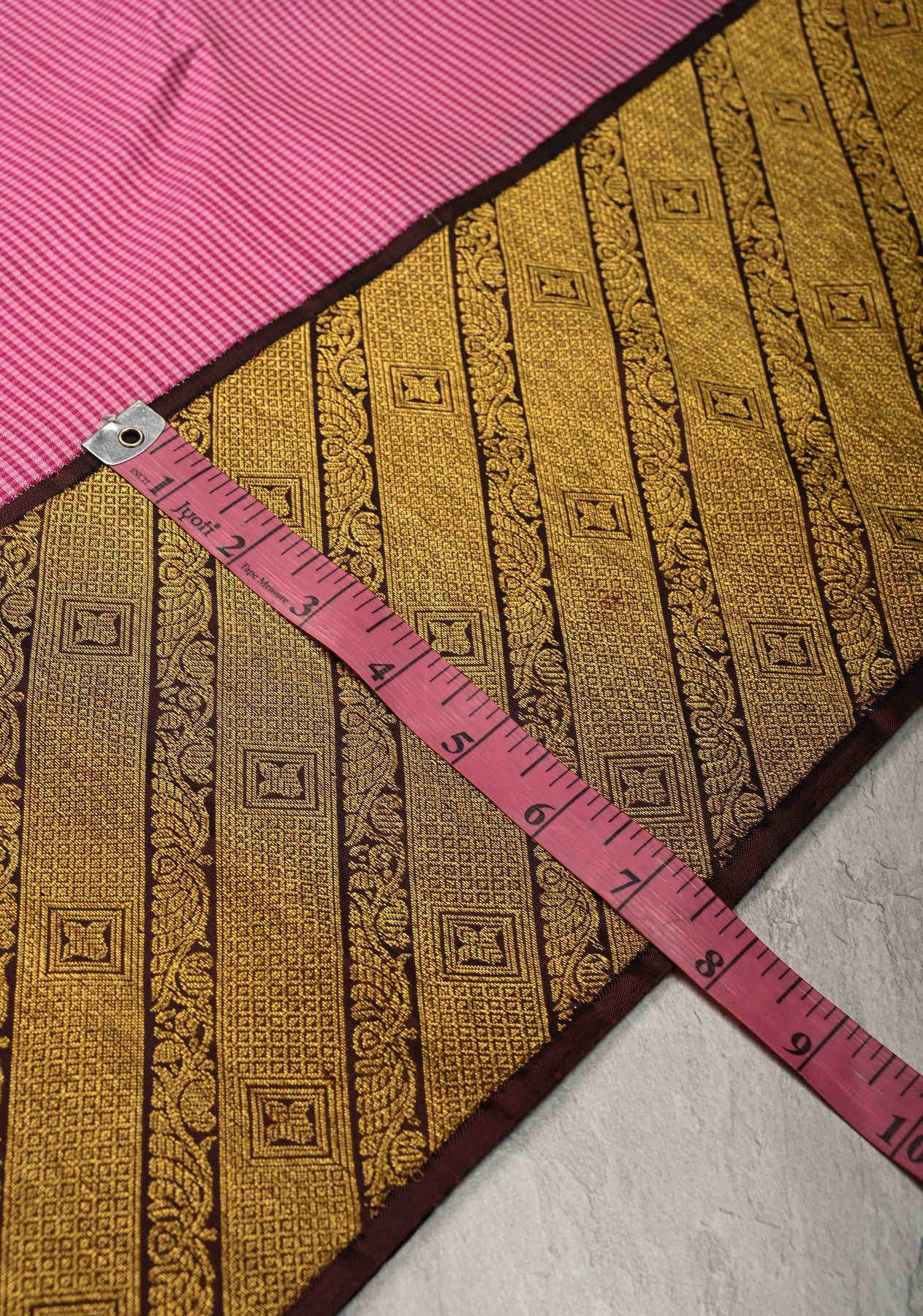 This Pink Pure Zari Korvai Kanjivaram Pure Silk Saree is a striking blend of heritage weaving and timeless elegance. The pink body is intricately woven with Podi-Kattam checks in pure zari, lending a luminous texture that reflects traditional sophistication. The saree is accentuated by a wide contrast zari border, crafted using the age-old Korvai technique, which ensures a seamless and bold transition between the body and the border. Handwoven from the finest pure silk and zari, this saree is perfect for weddings, temple ceremonies, and festive occasions where grace and grandeur are essential.