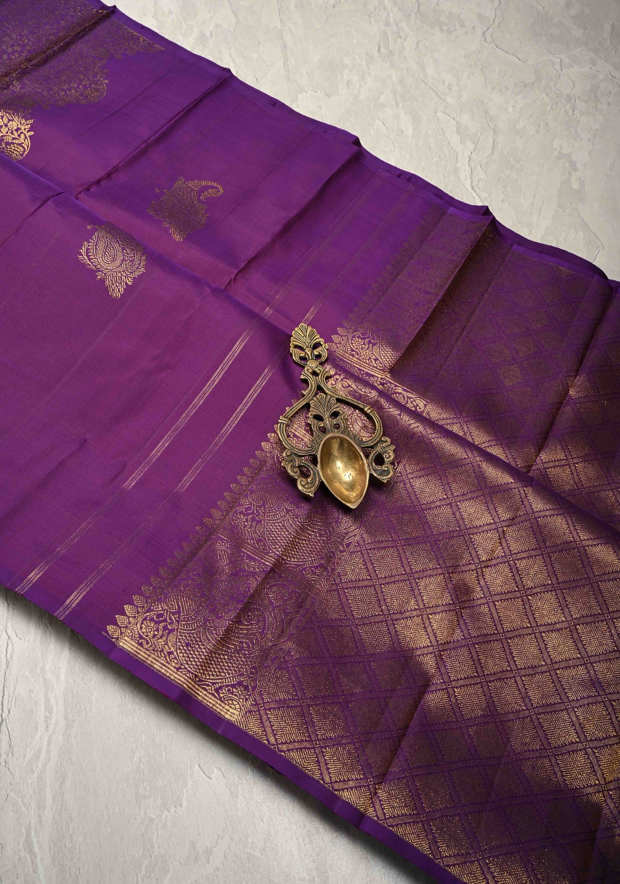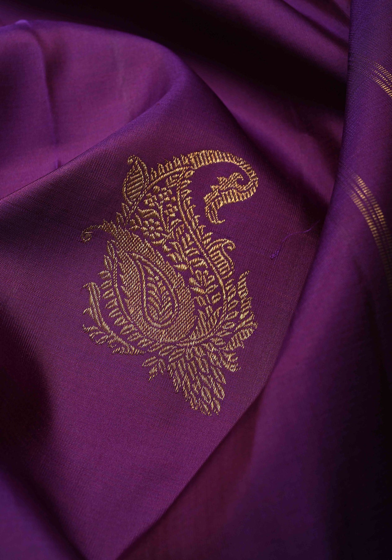 Borderless Plum Kanjivaram Pure Silk Saree with Paisley Motifs and Weavy Design Zari Panel | SILK MARK CERTIFIED
