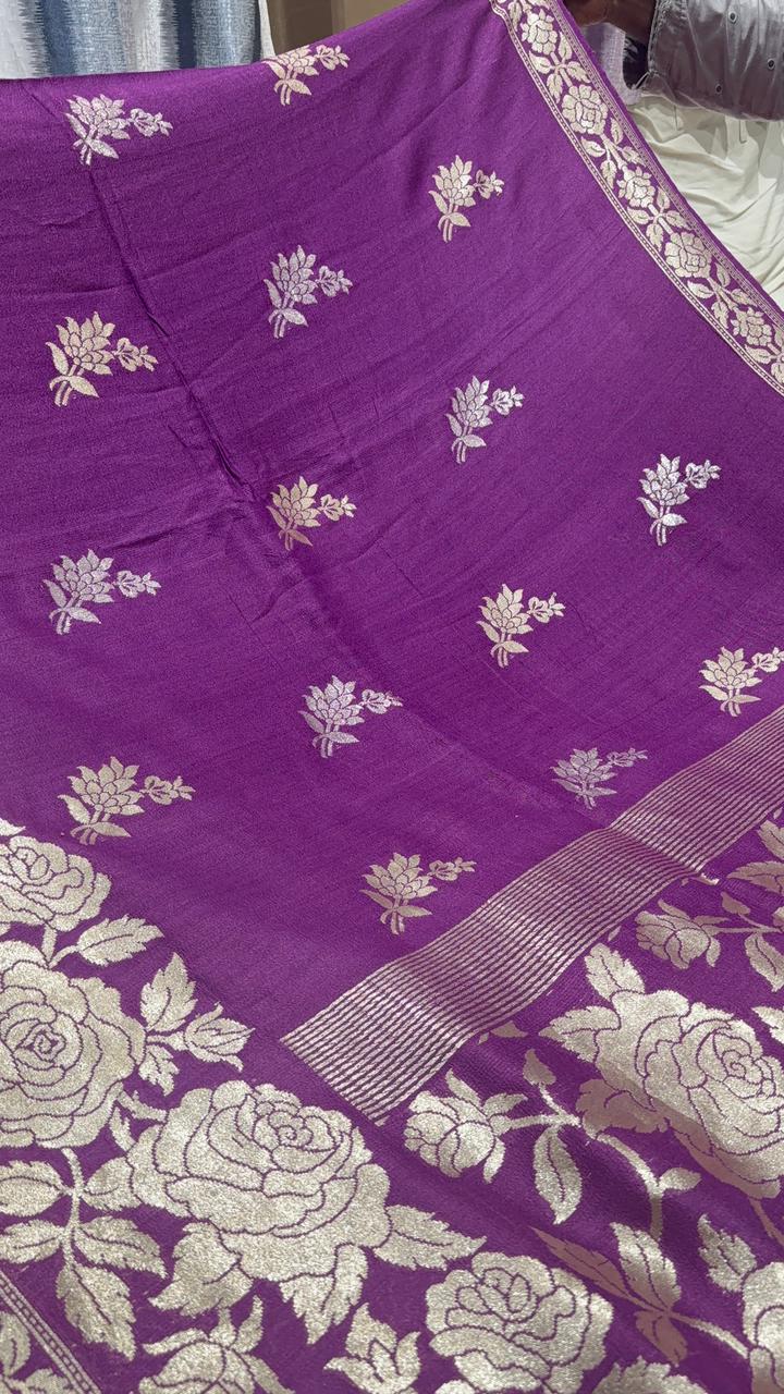 Graceful and timeless, this Purple Tussar Georgette Saree beautifully marries delicate floral artistry with classic Banarasi elements. Crafted from lightweight tussar georgette, it offers a soft, textured drape with a natural sheen—perfect for both festive and formal occasions.