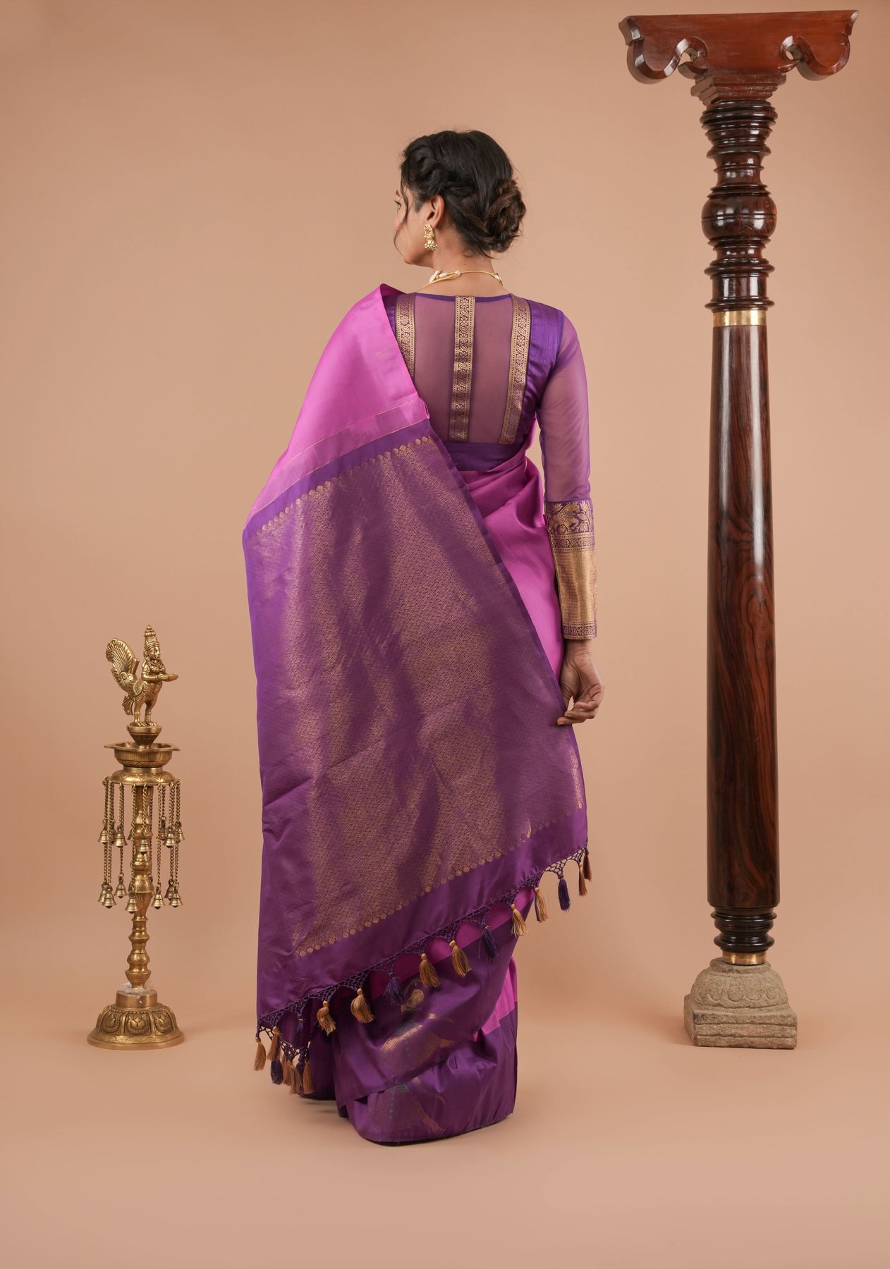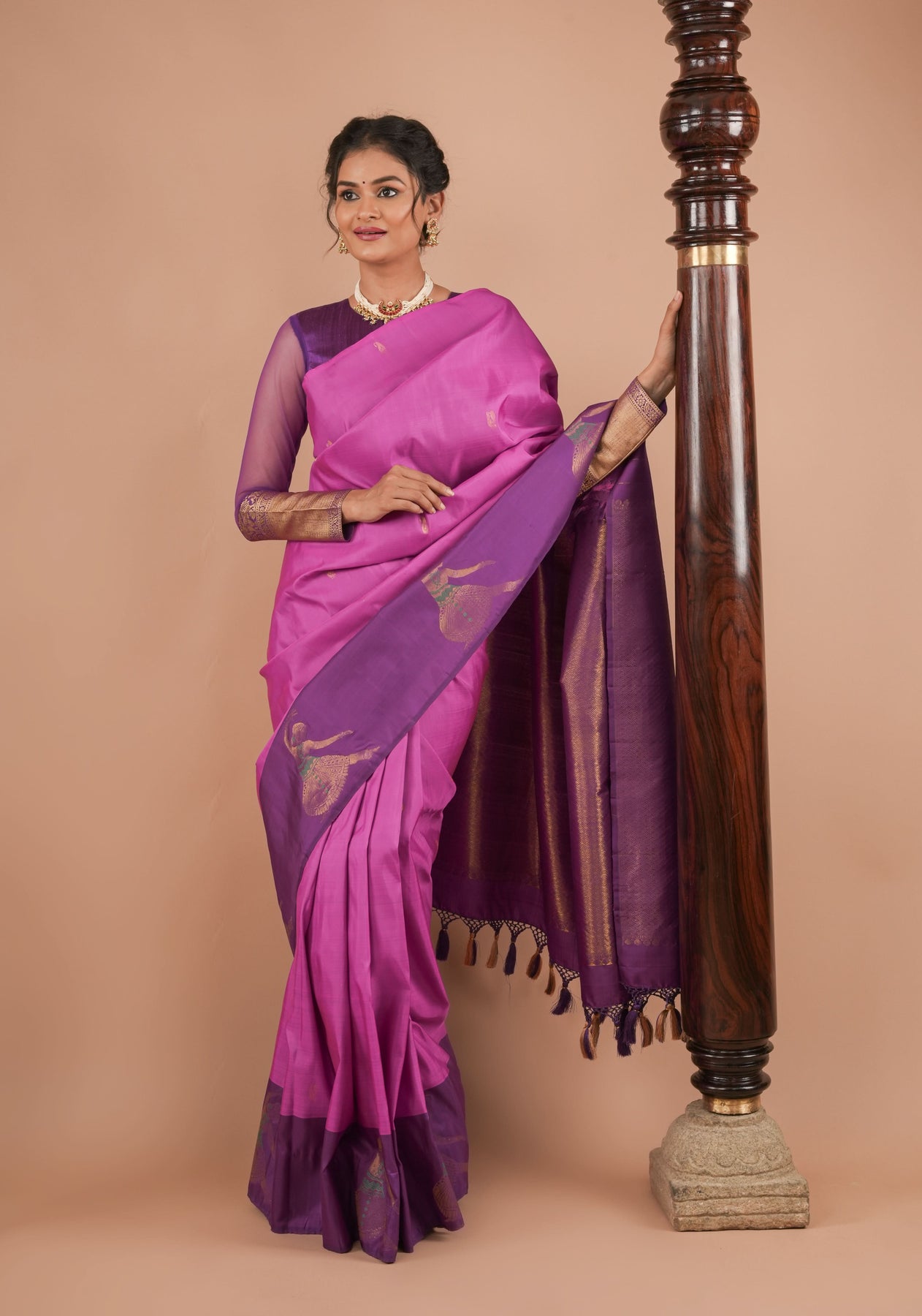 The Purplish Pink Silk Kanjivaram Saree is a stunning blend of tradition and elegance, perfect for any special occasion. Crafted from luxurious silk, this saree features a rich purplish pink hue that exudes a regal charm. Its border is adorned with distinct dancing buttas, meticulously woven in intricate patterns that evoke the graceful movements of classical dance forms.