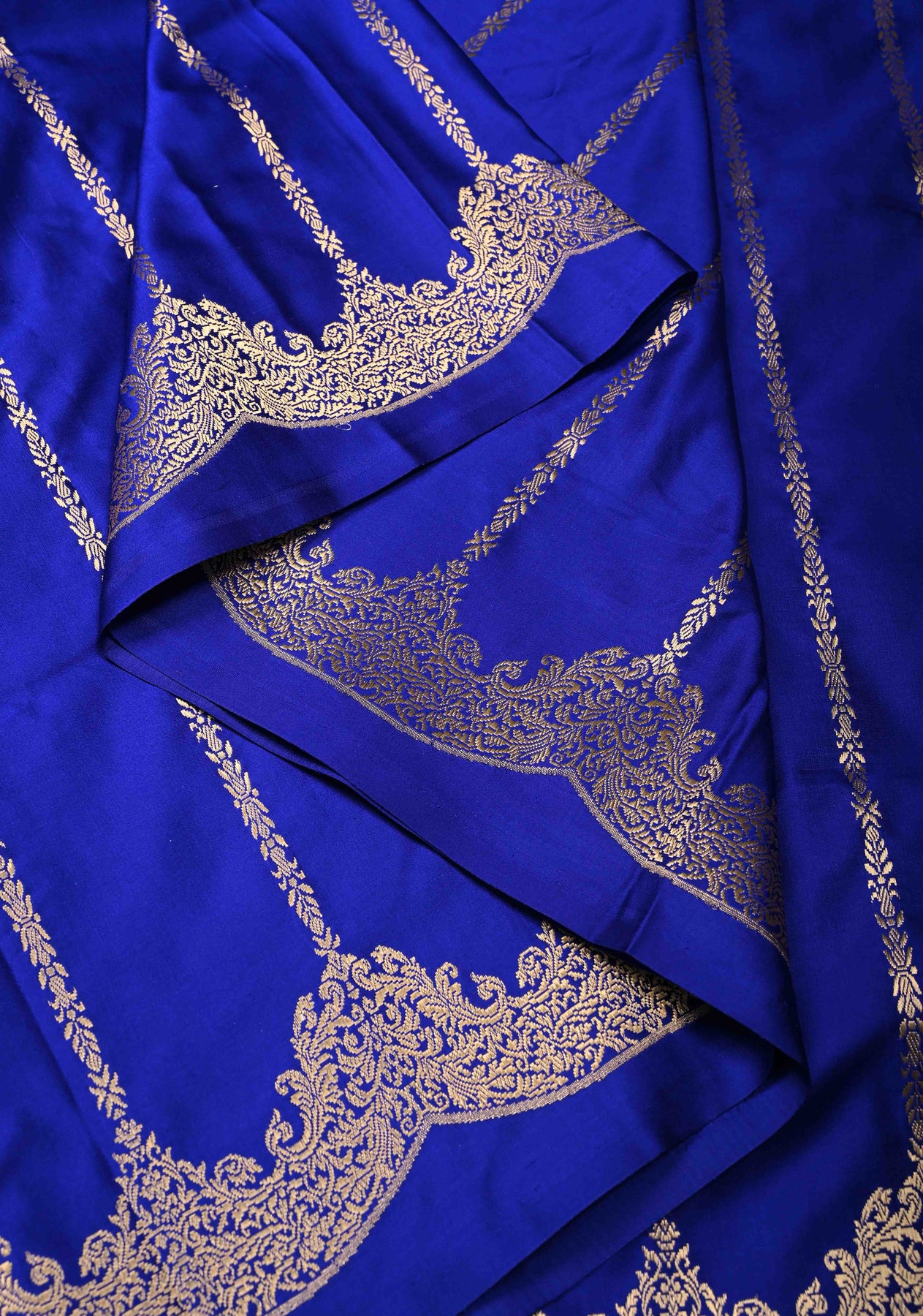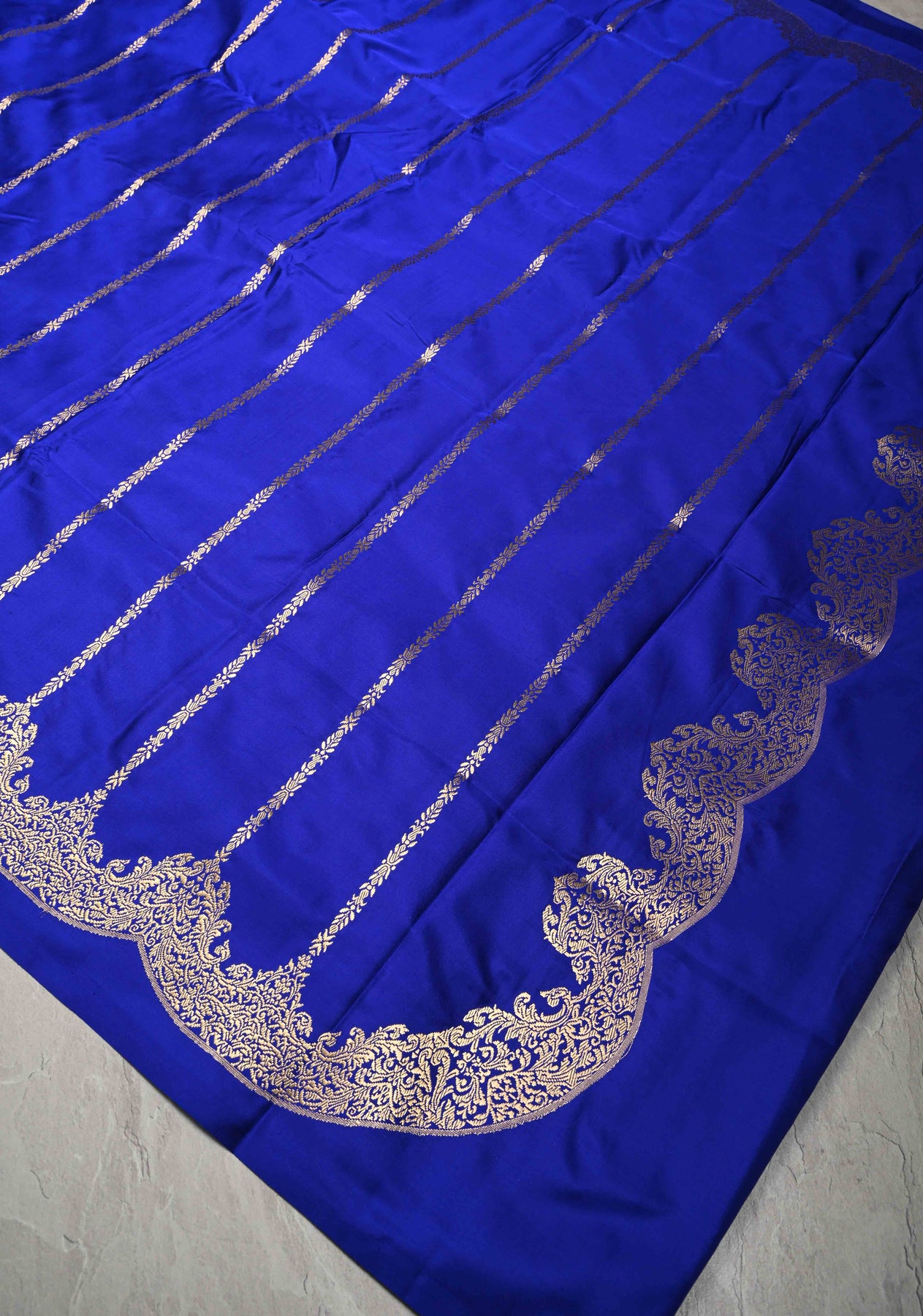 The rich royal blue base is adorned with a subtle striped pattern running across the body, adding depth and sophistication to the look. A striking Zari border in golden tones frames the saree gracefully, lending a regal touch that makes it ideal for festive occasions, weddings, or evening events.