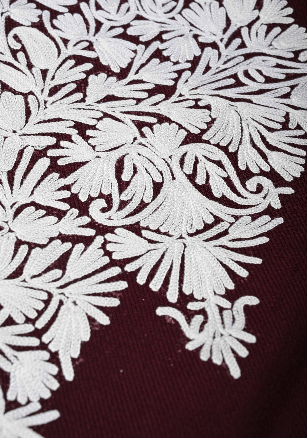 Vine Purple Polywool Poncho. The rich purple hue provides a beautiful canvas for the intricate Kashmiri Aari design, meticulously embroidered to bring delicate patterns to life. Playful tassels add a touch of bohemian charm and movement. Crafted from soft polywool, this poncho offers comfortable elegance and versatile layering. Perfect for adding a unique touch of handcrafted style to your wardrobe, it’s ideal for cooler evenings or as a chic fashion statement.