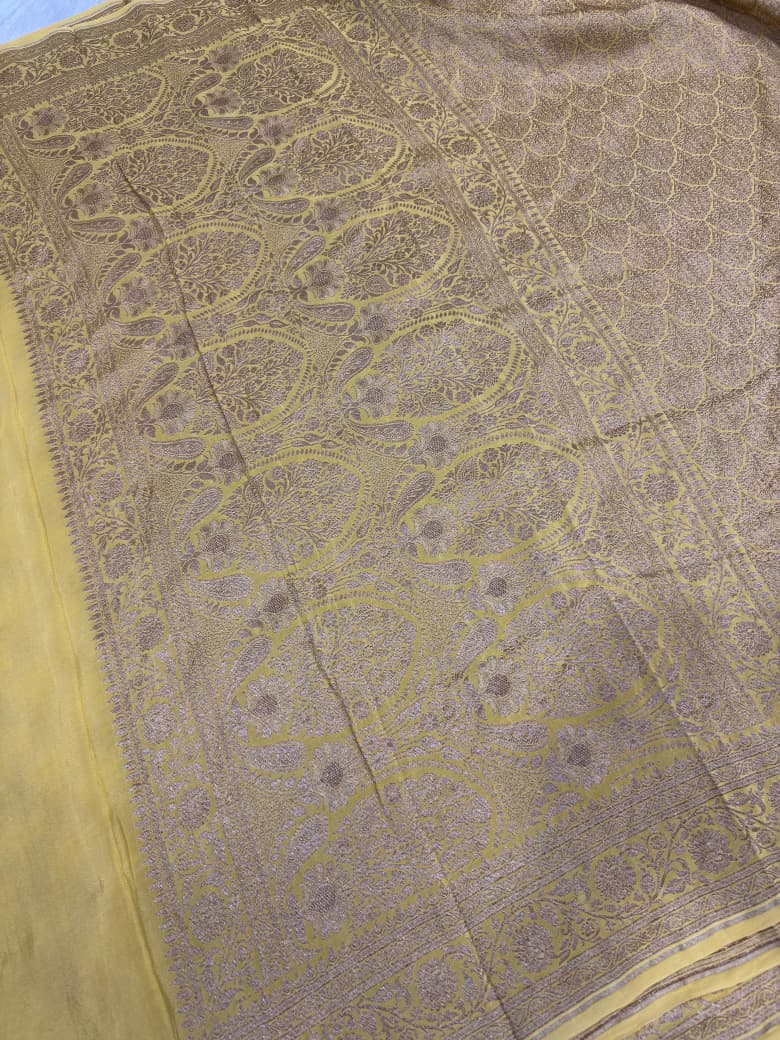 This Yellow Banarasi Georgette Silk Saree radiates timeless elegance and traditional grandeur. Woven from georgette silk, it features intricate antique zari brocade work that adds depth and richness to the yellow base. The antique-finish zari border further enhances its regal charm, offering a vintage appeal that sets it apart. With its fluid drape and exquisite craftsmanship, this saree is ideal for weddings, cultural celebrations, and festive occasions where grace and heritage meet.