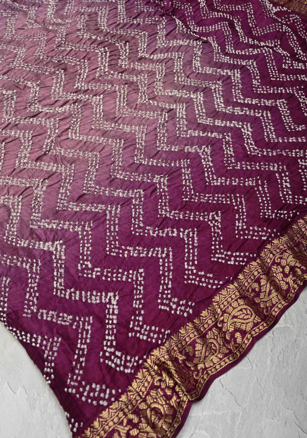 Pure gajji silk with Nakshi Border and sarkam Bandhej Chevon Pattern in Plum | SILK MARK CERTIFIED