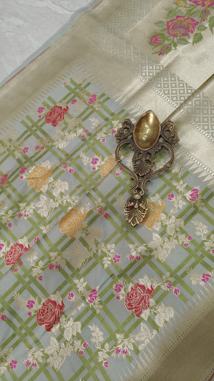 Gray Checks on Semi Silk Saree with Meenakari Floral Design and Zari Border