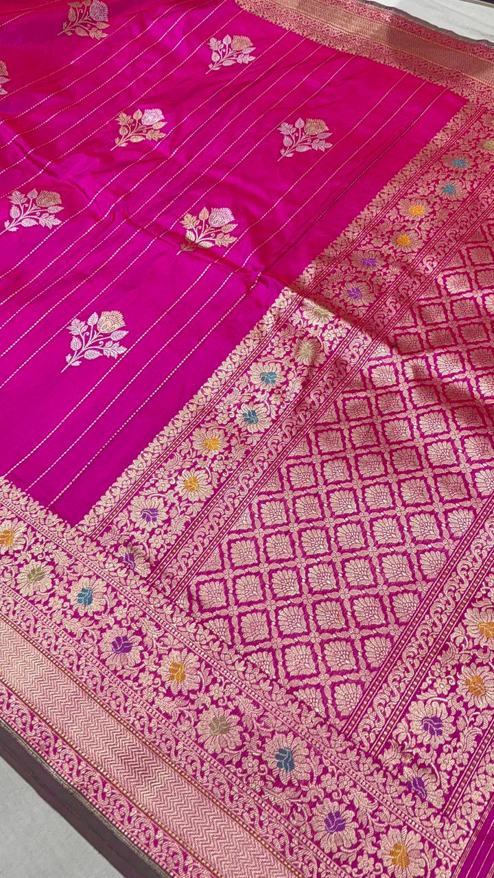 Rani Pink Zari Stripes on Banarasi Pure Katan Silk Saree with Alfi Floral Buttas and Meenakari Zari Border | SILK MARK CERTIFIED