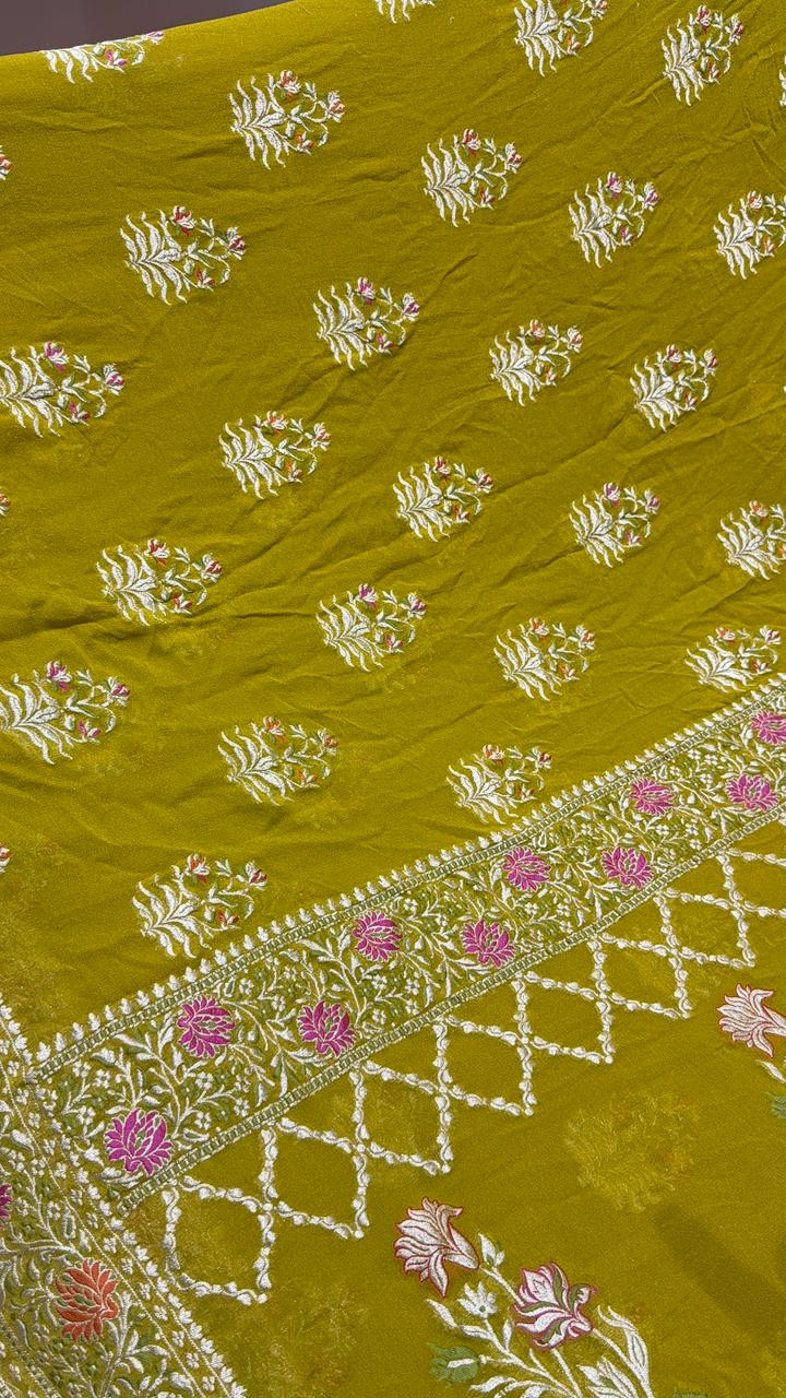 Authentic Moss Green Banarasi Silk Georgette Saree with Persian Inspired Floral Buttas and Meenakari Ornate Border | SILK MARK CERTIFIED