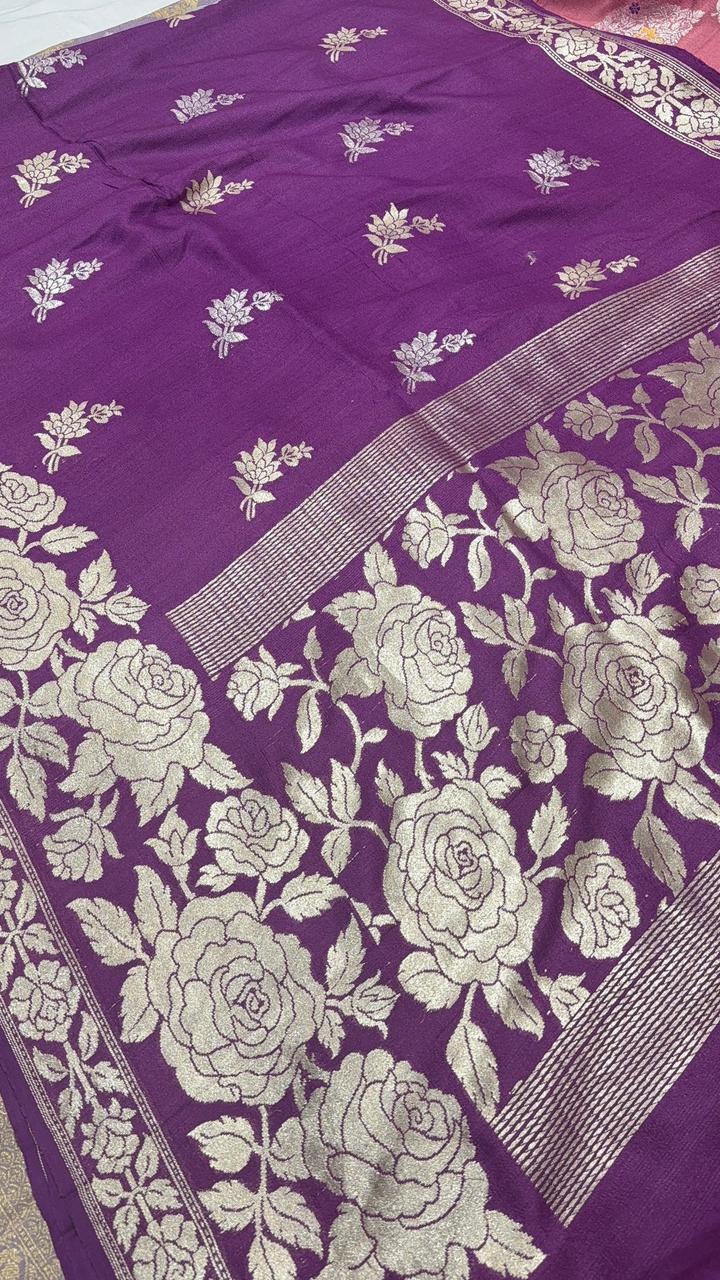 Purple Dual Tone Pure Banarasi katan silk saree with Kadhuwa Jungla Meenakari Sona Rupa Buttas and Scallop Border |SILK MARK CERTIFIED