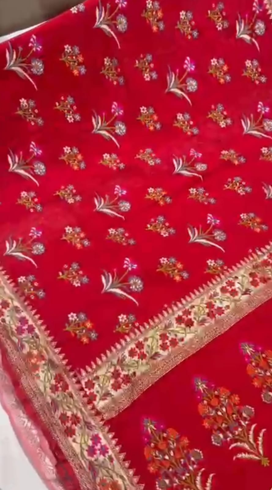 Authentic Deep Red Meenakari Detailing on Banarasi Silk Georgette Saree with Floral Buttas and Zari Border | SILK MARK CERTIFIED