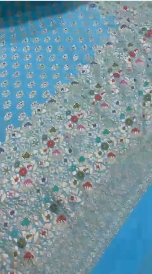 Authentic Turquoise Meenakari Work on Banarasi Silk Georgette Saree with Floral Buttas and 2 Side Equal Ornate Skirt Border | SILK MARK CERTIFIED