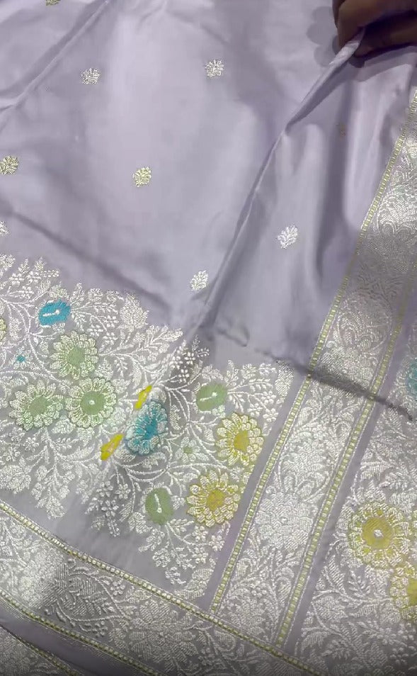 Lilac Banarasi Pure Katan Silk Saree with Sona Rupa Floral Buttas and Geometric Meenakari Buttas on Wide Zari Border | SILK MARK CERTIFIED