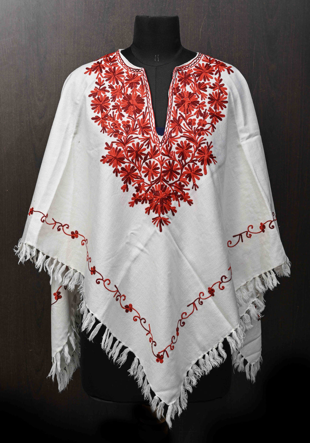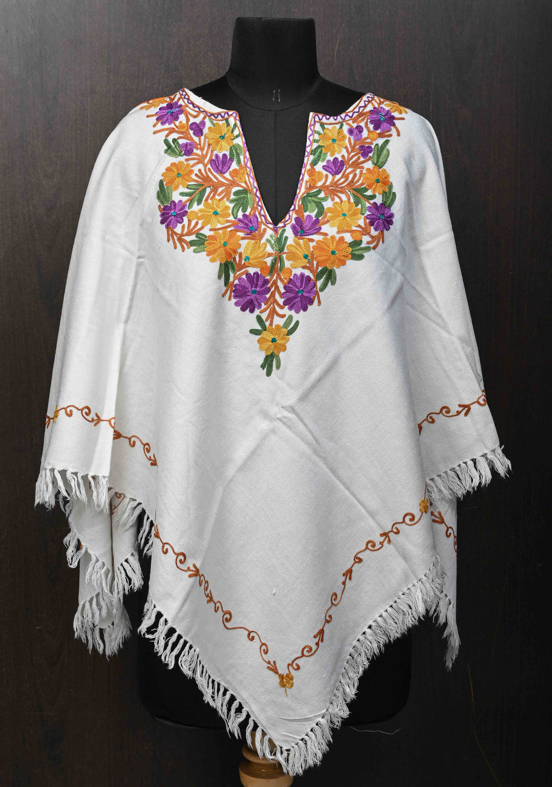White Polywool Poncho with Kashmiri Aari Design and Tassels - one size fits most