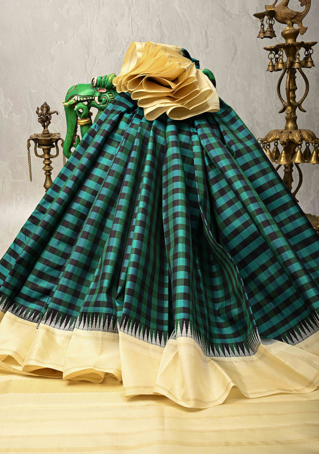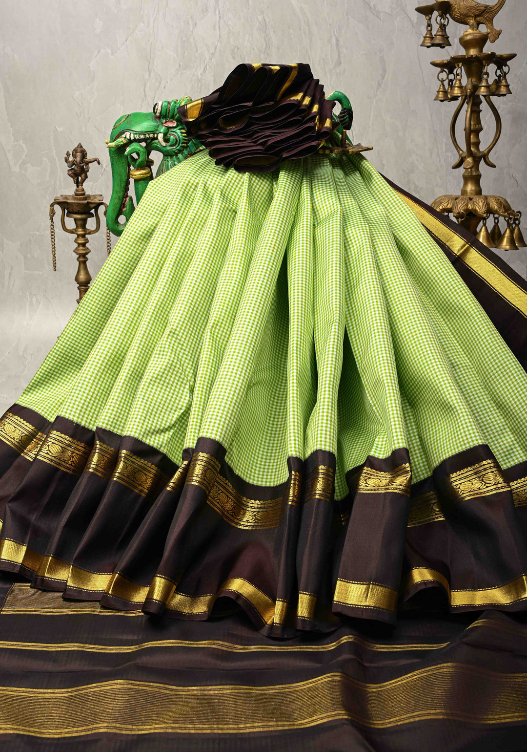 Green -White Vintage Checks on Kanjivaram Pure Silk Saree with Contrast Rettaipet Zari Border | SILK MARK CERTIFIED