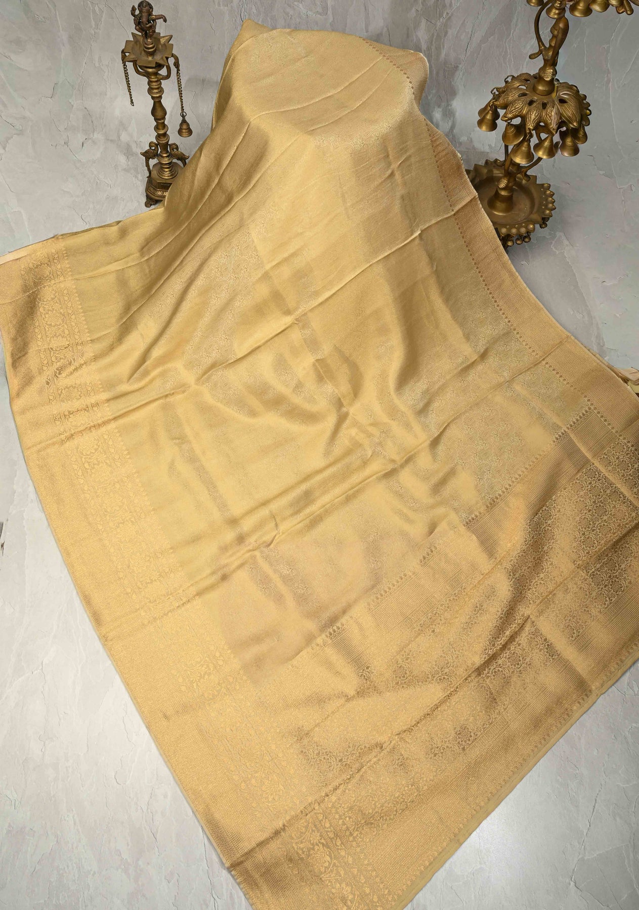 Embrace timeless sophistication with this elegant Beige Saree, featuring the graceful drape and subtle luster of Vegan Viscose Silk. This sustainable fabric choice offers all the luxury of silk while remaining cruelty-free.