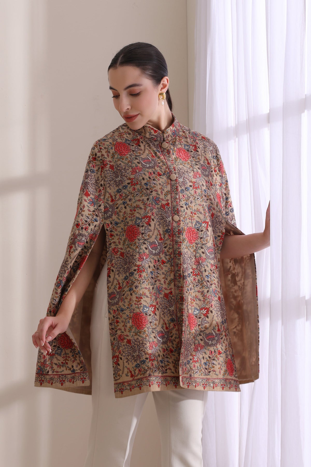 The Gulab embroidered cape features exquisite floral motifs in vibrant red and multicolor threads on a neutral base. Tailored with a structured silhouette and front button closure, this statement piece blends traditional craftsmanship with modern elegance, making it perfect for festive occasions or elegant evenings. A timeless luxury addition.