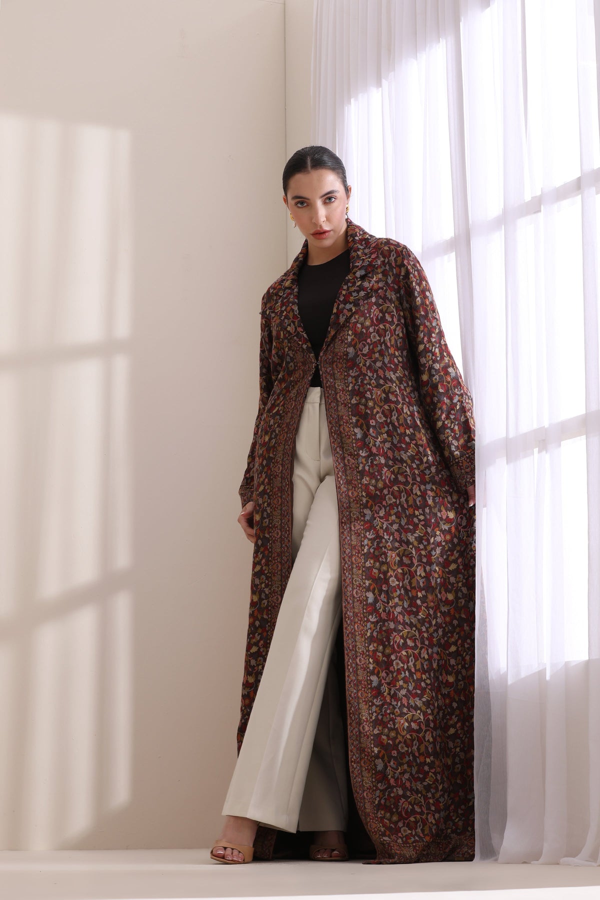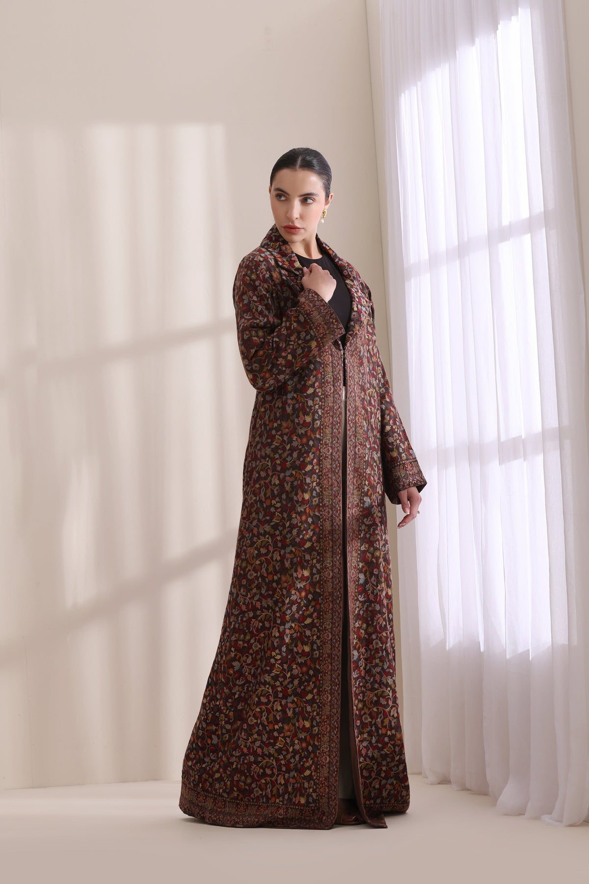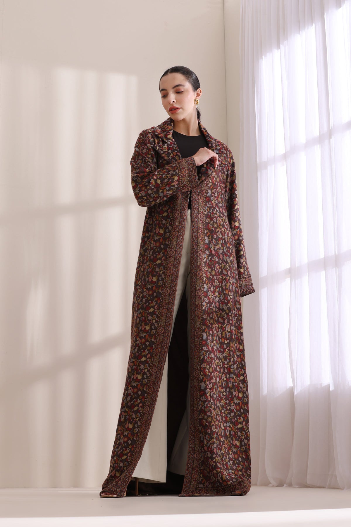 This luxurious Kashmiri Kani woven jacket is designed for the modern connoisseur of fine craftsmanship, blending traditional artistry with contemporary elegance. The full-length jacket features kani design age-old techniques from Kashmir. Crafted from premium wool, the jacket offers warmth, comfort, and a timeless appeal, making it a standout piece for winter wardrobes