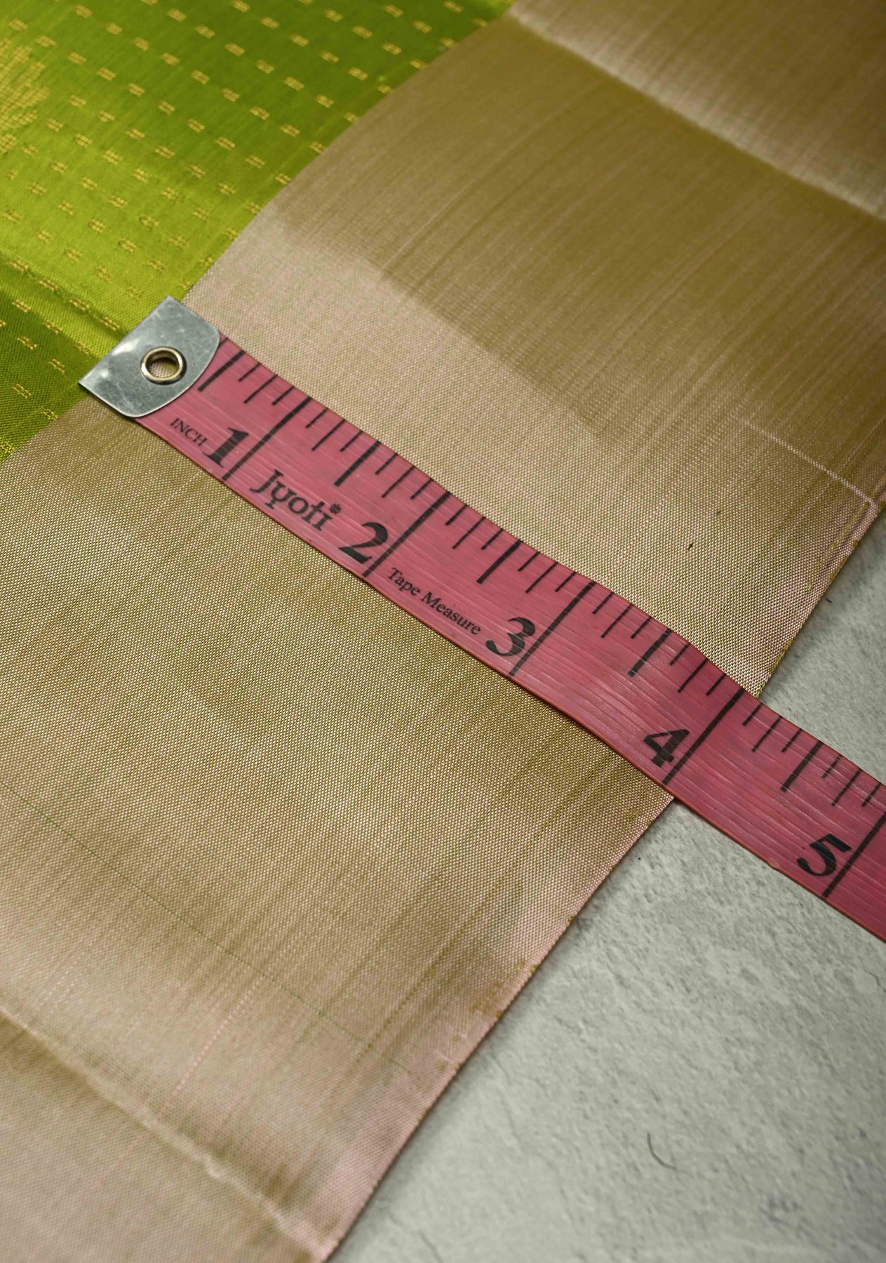 The body features finely woven zari stripes, adding a soft, sophisticated sheen, while the scattered zari buttas bring traditional intricacy and to the overall design. Complementing the vivid color is a bold contrast border, crafted with classic Kanjivaram finesse to enhance the saree’s regal aesthetic.