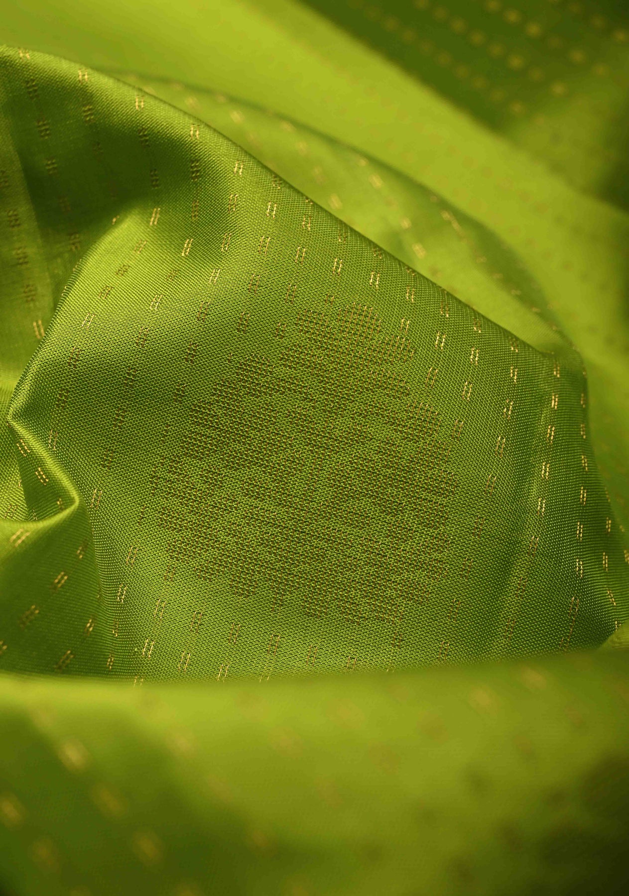 Step into vibrant elegance with this Parrot Green Kanjivaram Soft Silk Saree, woven to perfection for a drape and timeless appeal. The lively parrot green hue lends a refreshing, luminous charm, making it an eye-catching choice for grand occasions.