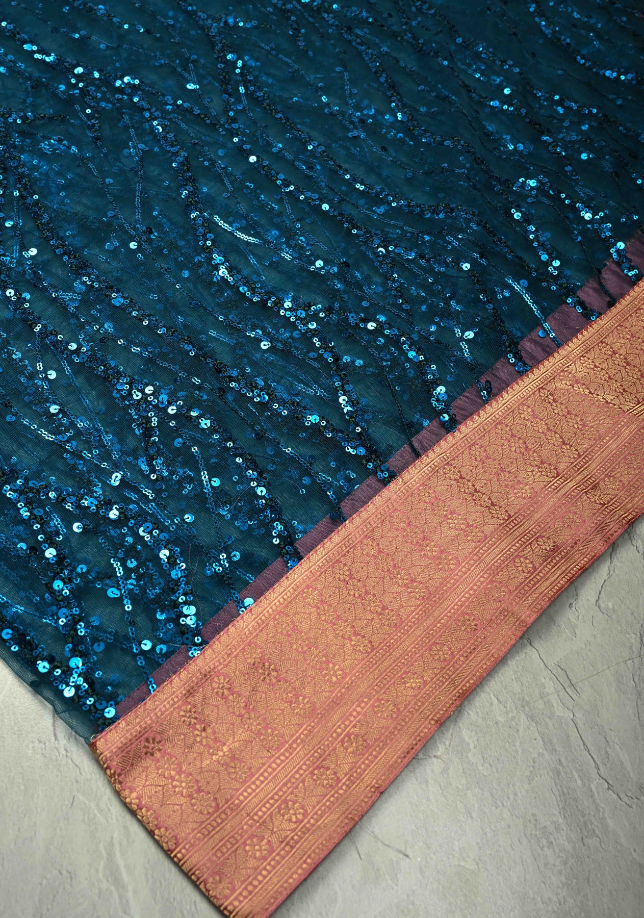 Experience modern elegance with this Peacock Blue Tone-on-Tone Sequin on Net Fusion Saree. The sheer net fabric is delicately embellished with shimmering tone-on-tone sequins, creating a subtle, all-over sparkle. This contemporary body is beautifully framed by a rich, traditional Two-Side Banarasi Pure Silk Border and Pallu, offering a stunning contrast in texture and ancient weaving technique. This exquisite piece is a perfect fusion of modern flair and timeless luxury, ideal for evening events and receptions.