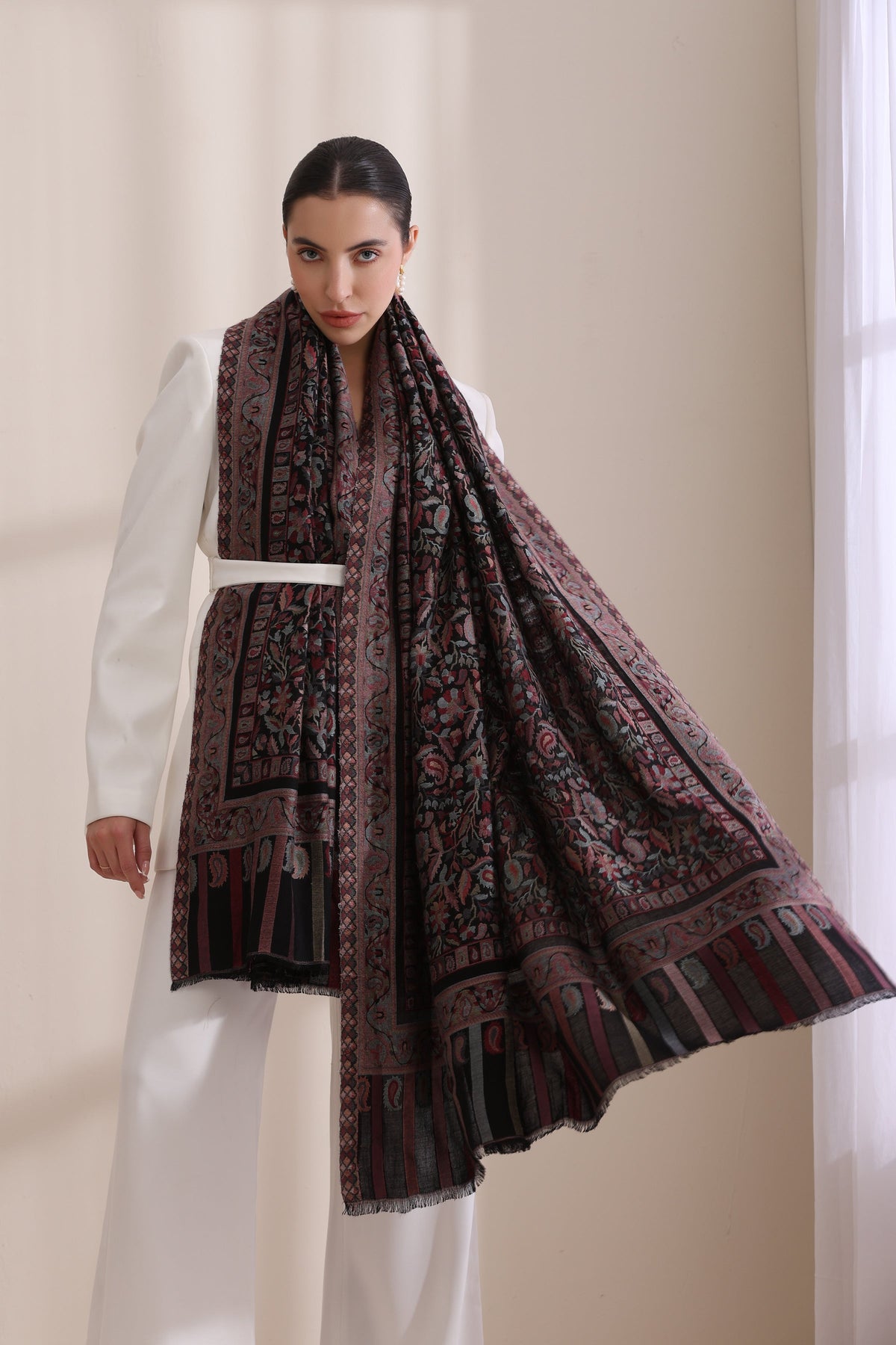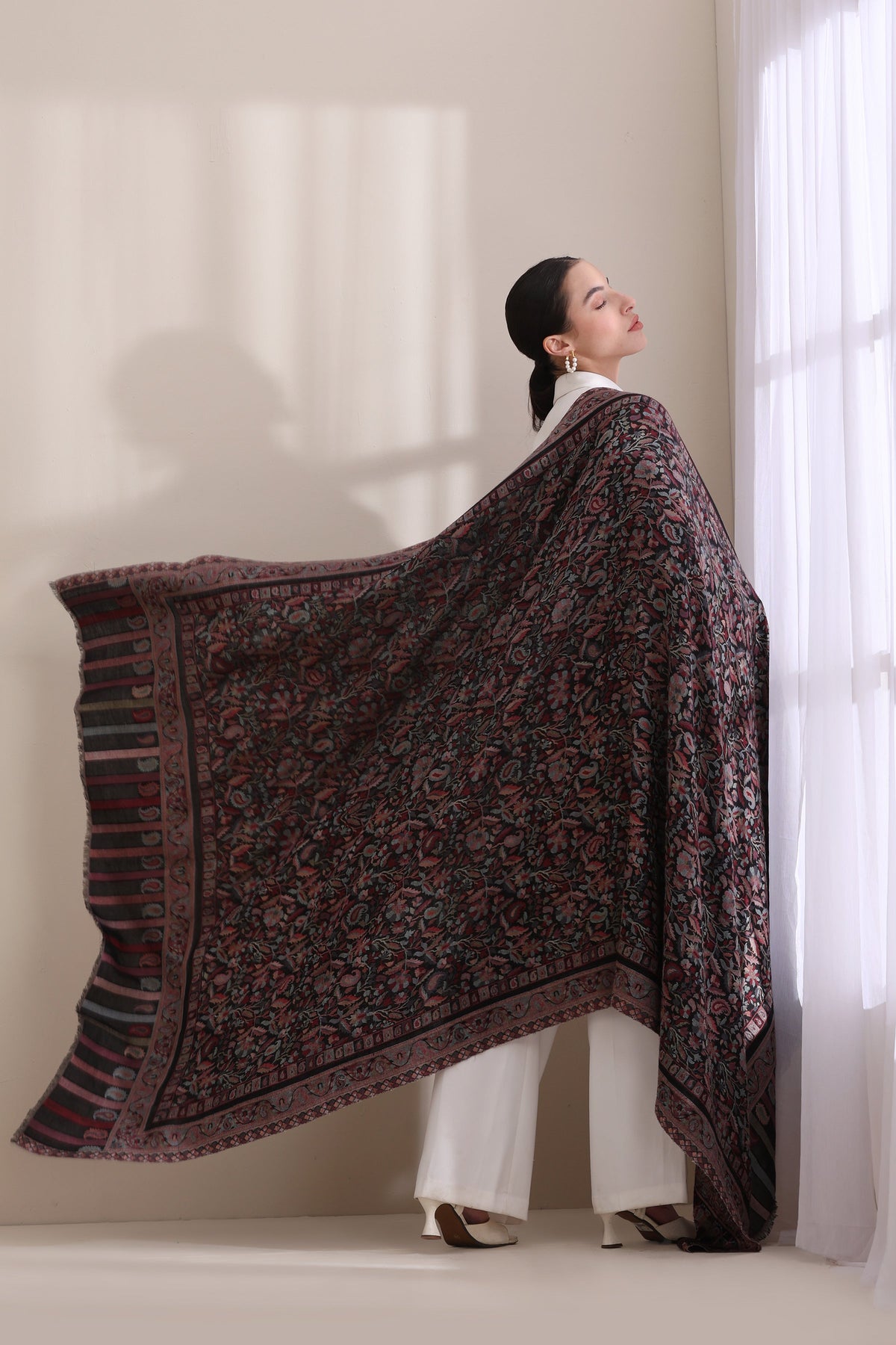 Luxurious black woven shawl featuring intricate multicolored kani motifs, perfect for special gifting. The delicate hues elevate its sophistication, while the fine allover design exudes timeless charm for the discerning luxury client. An exquisite accessory that embodies grace, tradition, and understated opulence for every occasion.