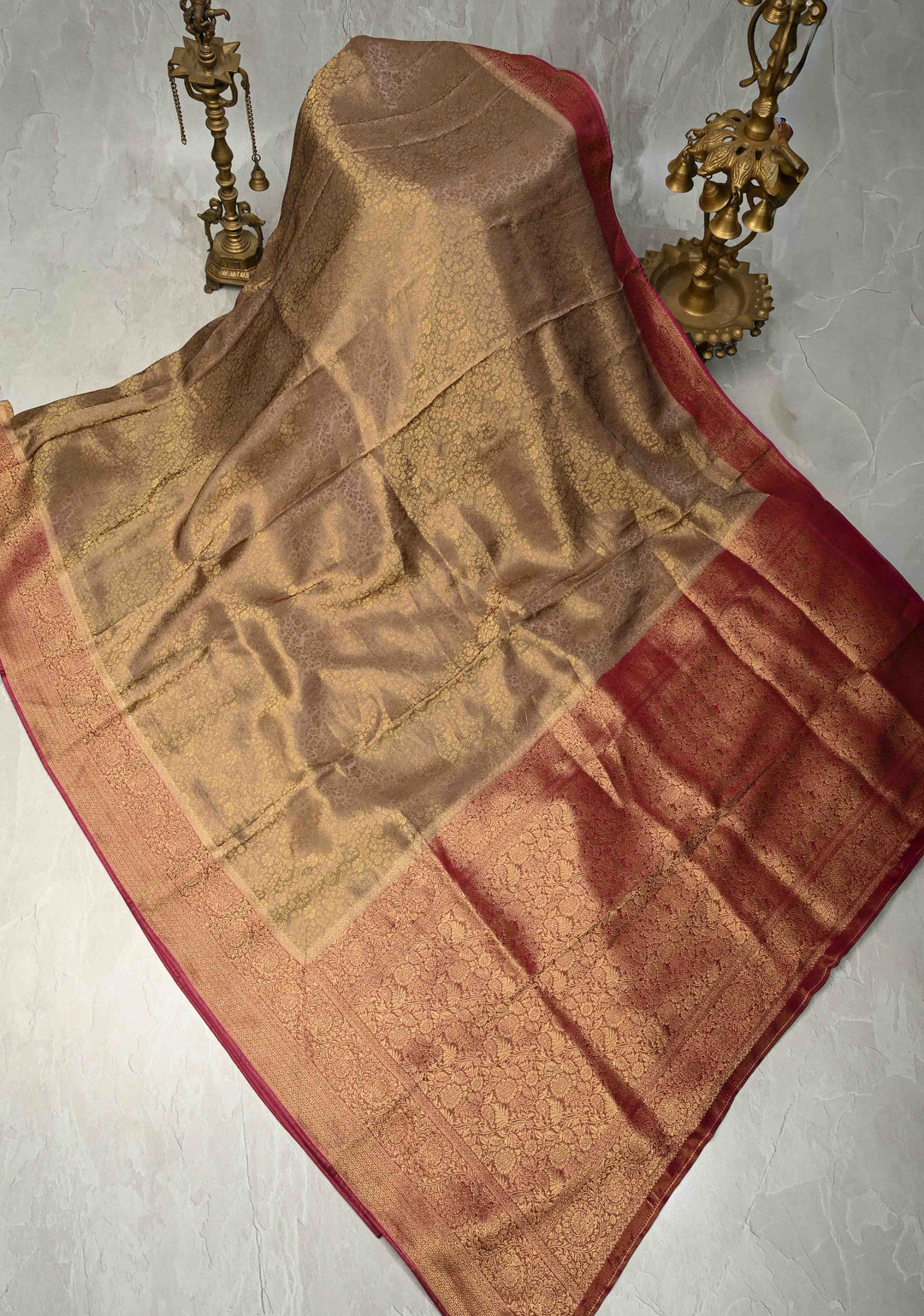 Light taupe Floral Brocade Vegan Viscose Silk Saree with Contrast Zari Border