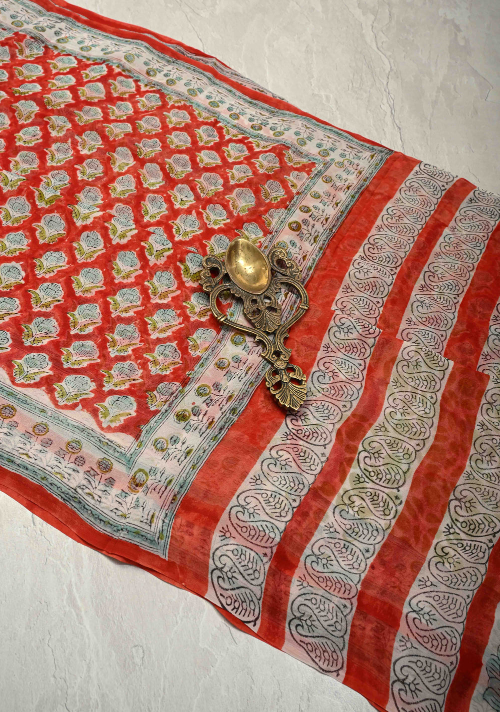 Brick Red Georgette Saree with Sanganeri Hand Block Print