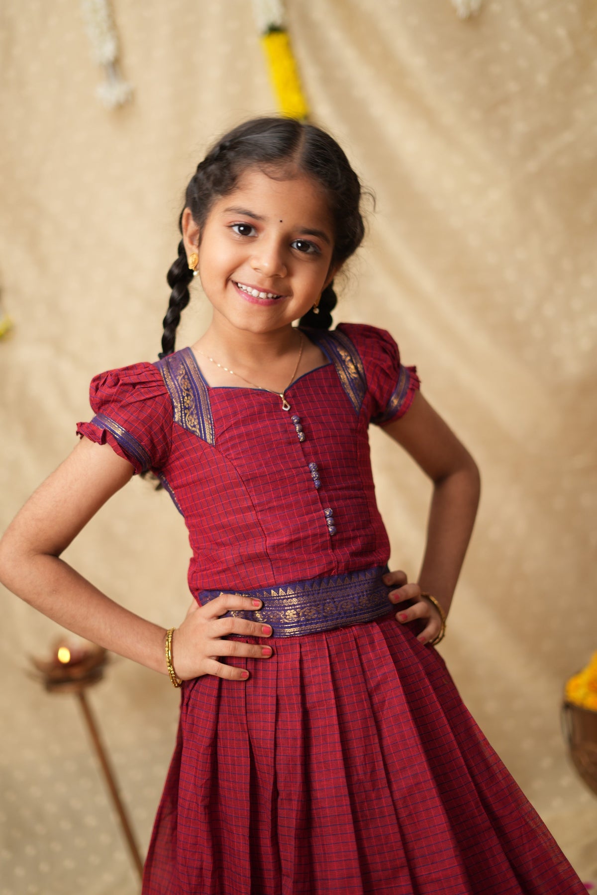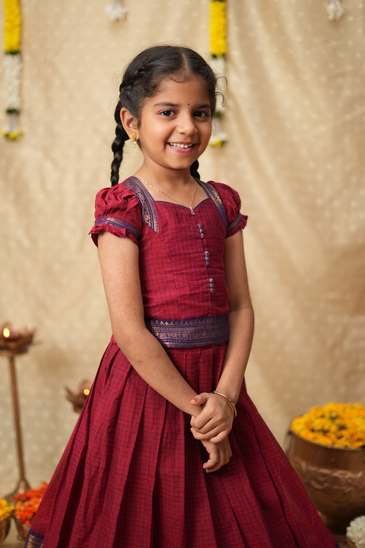 The Esha Wine Check Lehenga Mini is a timeless Chettinad-inspired kids’ lehenga crafted in handloom cotton for a rich traditional charm. Featuring a fitted puff-sleeve blouse with sweetheart neckline and a flared checked lehenga, this set is finished with a vibrant magenta zari border that adds a festive radiance. Perfect for poojas, temple visits, weddings, and cultural celebrations, this lehenga blends comfort with regal elegance for your little one."