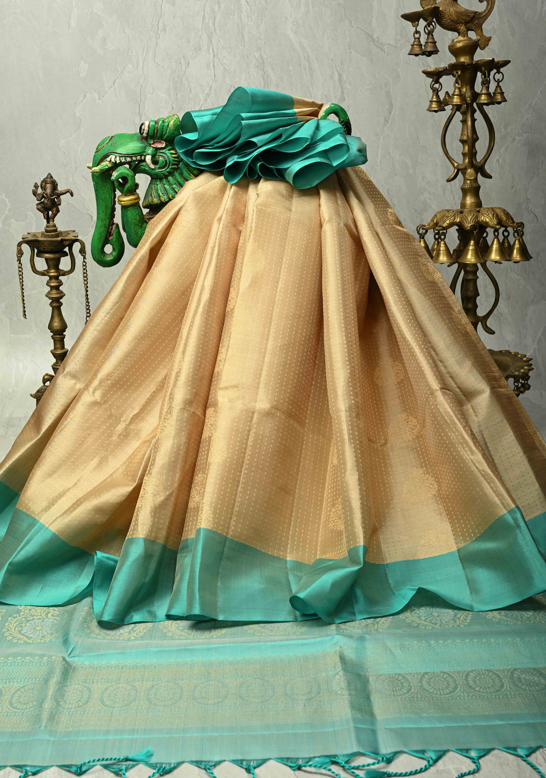 Green Dual tone Kanchi Semi Silk Saree with Temple Chariot Zari Buttas and Contrast Zari Border