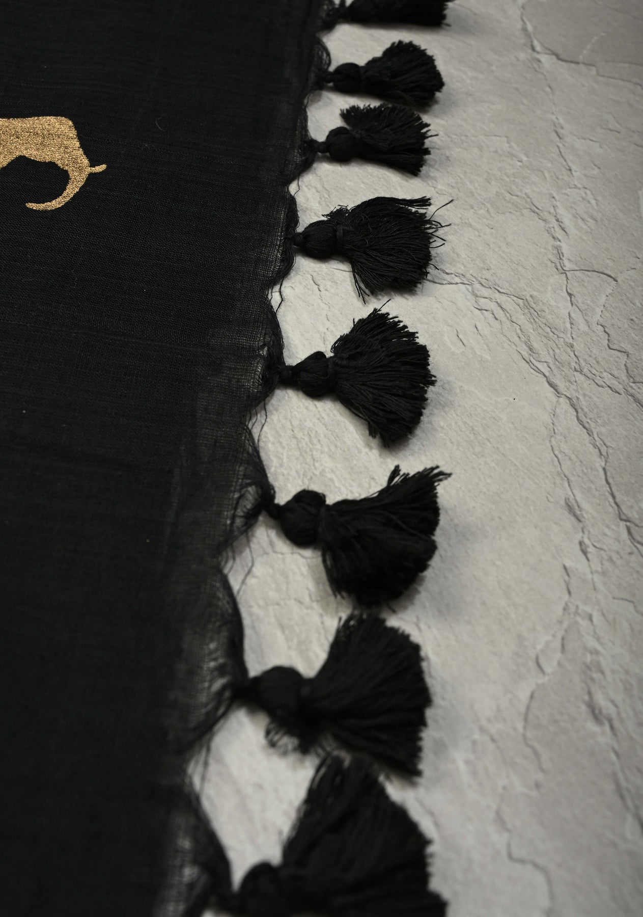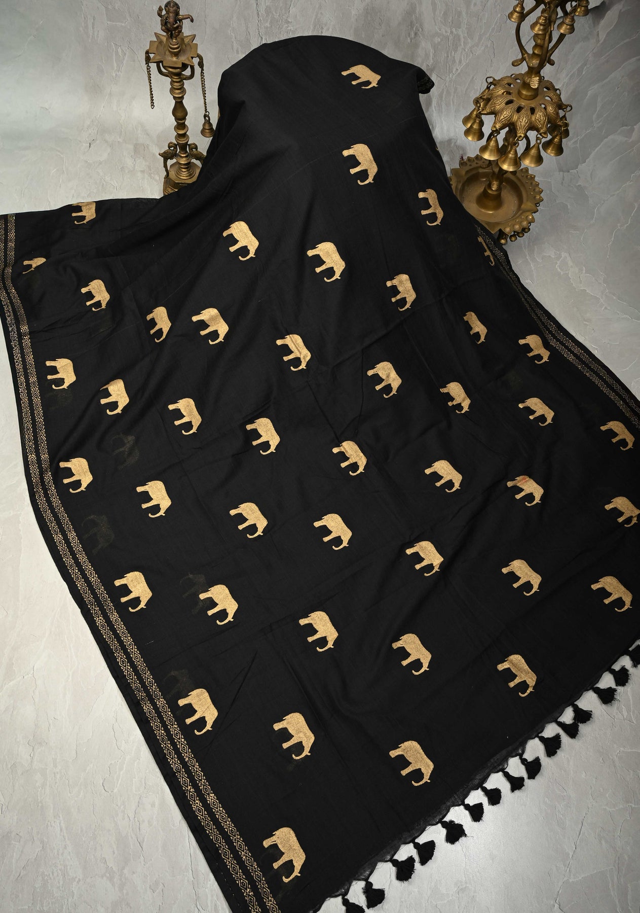 Celebrate understated elegance with this Black Uppada Cotton Saree, beautifully handcrafted for a timeless look. Woven from fine Uppada cotton, the saree features charming elephant buttas, symbolizing strength, wisdom, and heritage. The minimal border enhances its clean and contemporary appeal while allowing the motifs to stand out. Lightweight, breathable, and softly draped, this saree is ideal for everyday wear, cultural gatherings, and relaxed festive occasions. Pair it with minimal jewelry for an effortlessly elegant ensemble.
