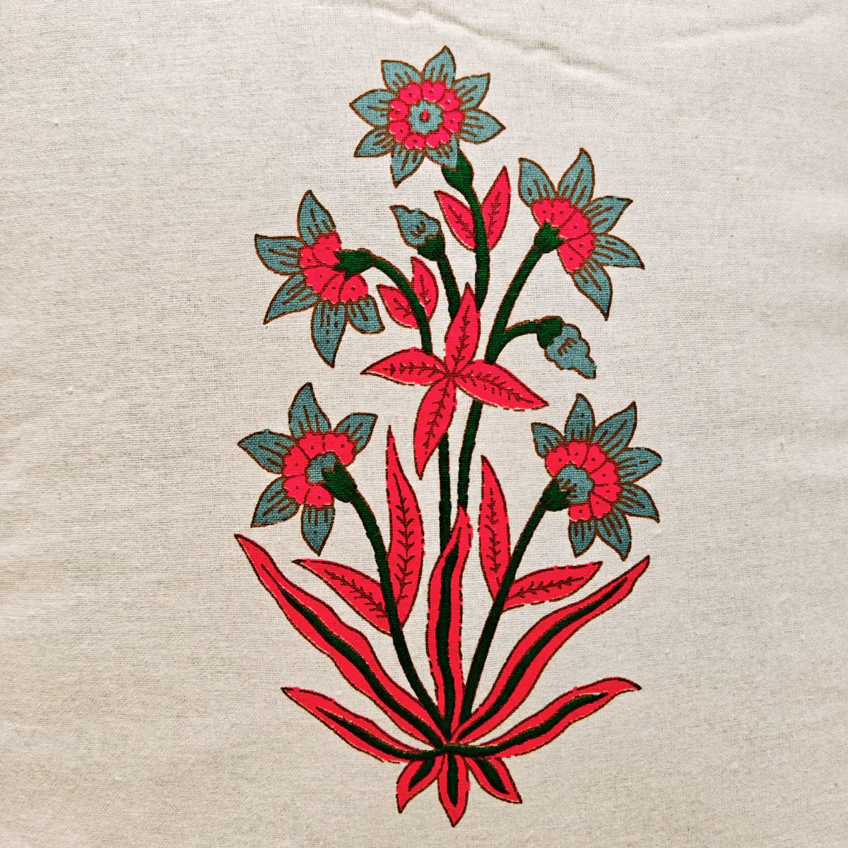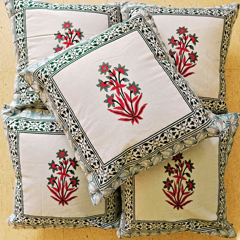 Each cover features bold floral motifs framed with intricate borders, inspired by classic Indian prints. The soft cotton fabric is enhanced with a foam layer for added support, ensuring both comfort and durability.