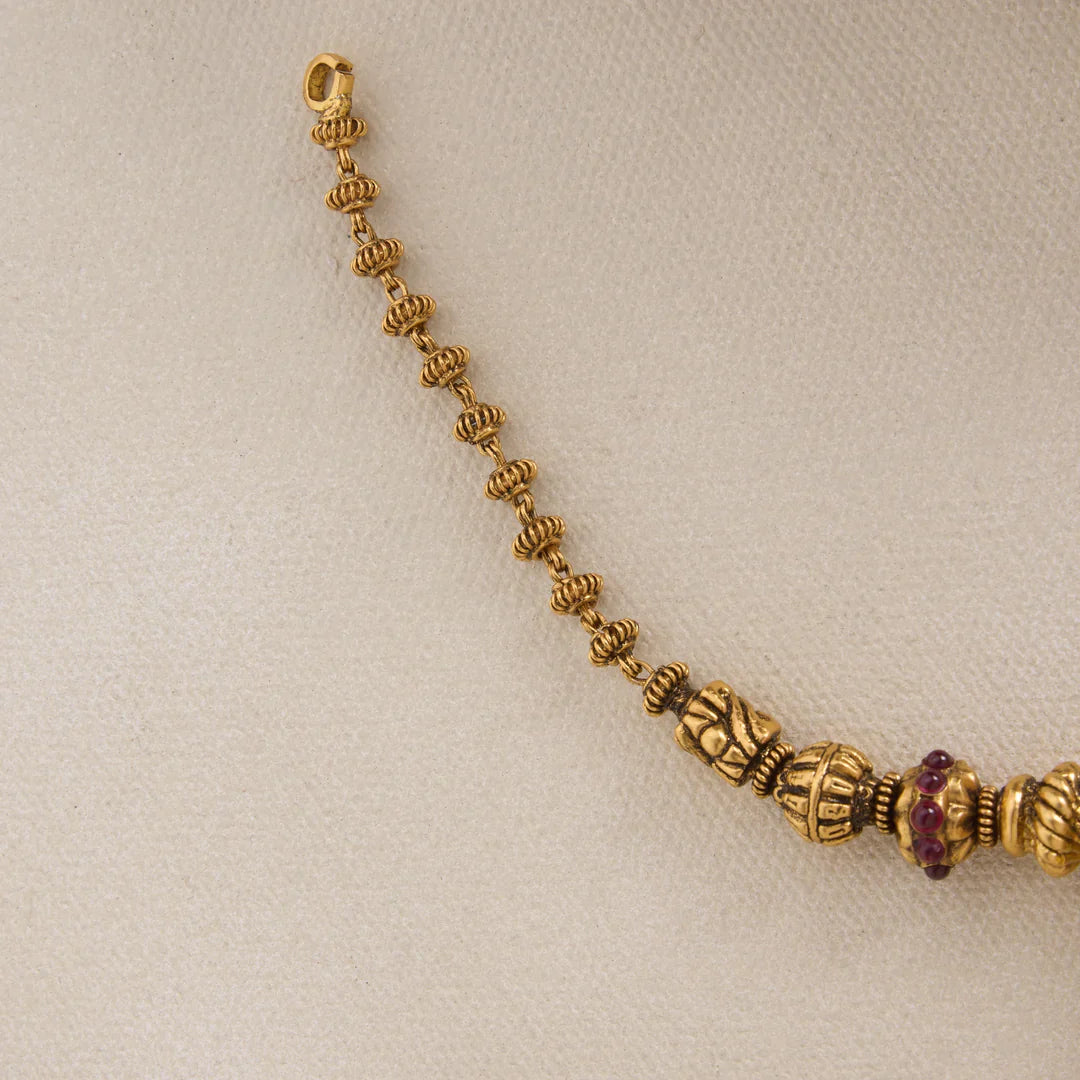 Elevate your ethnic ensemble with this exquisitely crafted Plume Leaf Necklace, a masterpiece of traditional artistry. Adorned with intricate Peacock and Mango motifs interspersed with delicate leaf designs, this necklace showcases premium CZ stones and Kundan work that catch light beautifully. The piece features graceful hangings of golden beads, rich Red beads, and lustrous Pearls, creating a harmonious blend of textures and hues. Anchored by an elegant gundu chain, this necklace combines timeless craftsmanship with sophisticated design, making it an ideal choice for festive occasions and special celebrations
