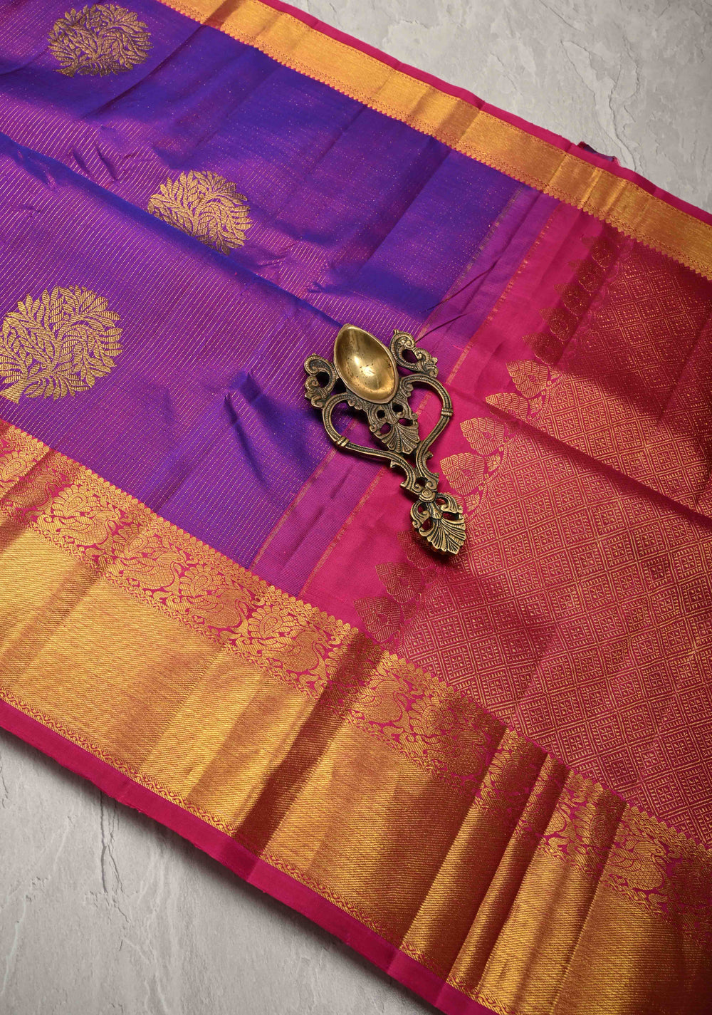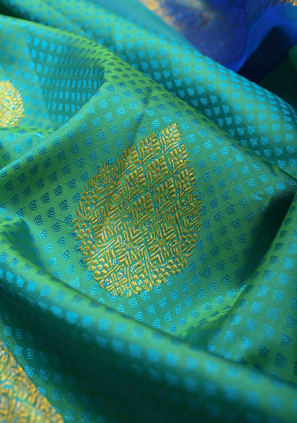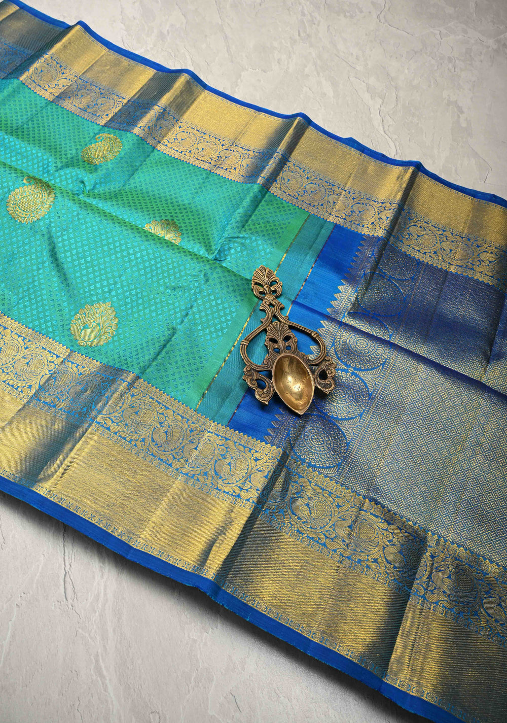Drape the pallu over your shoulder, stylishly showcasing the dual colors.