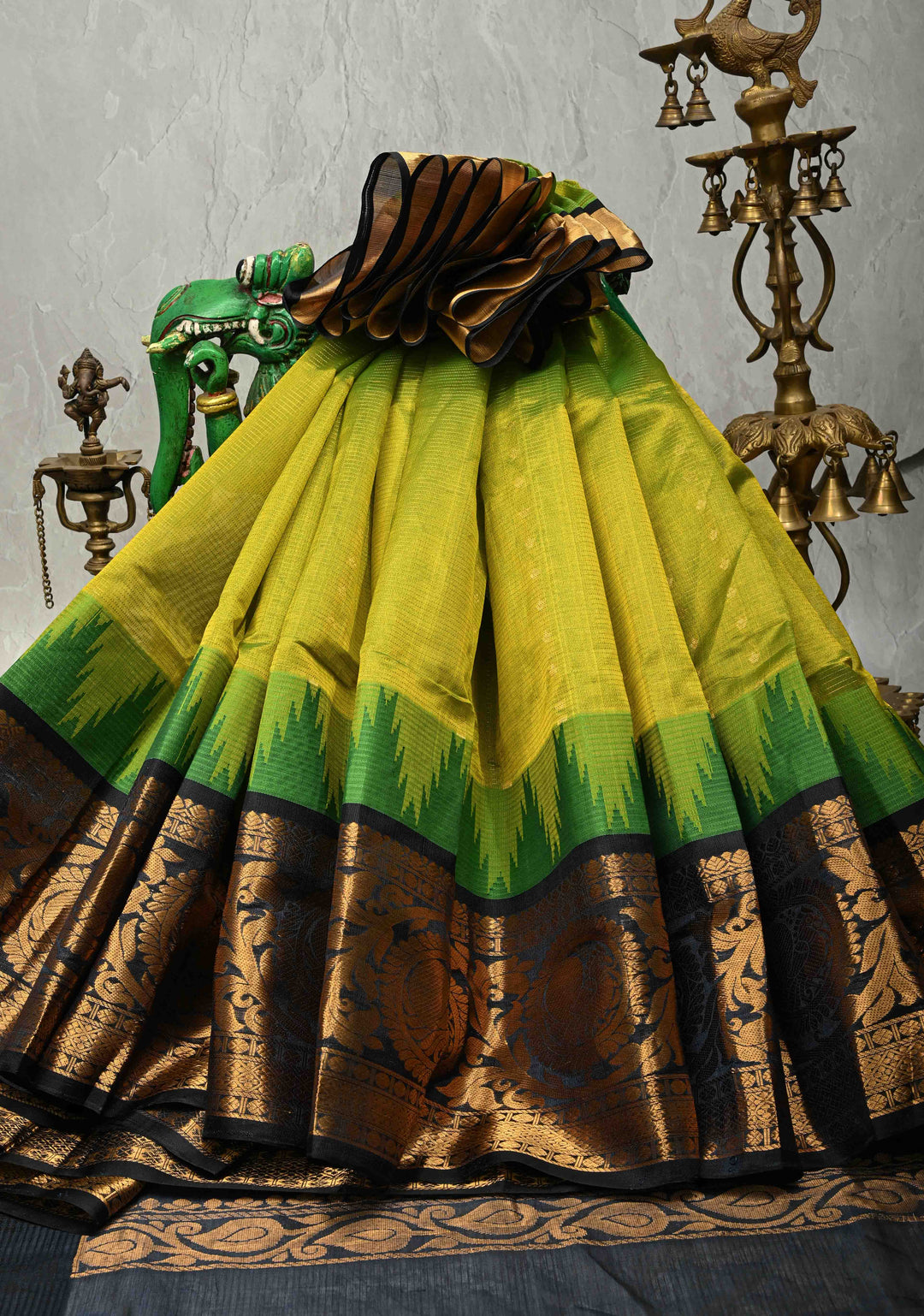 How to Style: Pair it with heavy traditional jewelry like gold or temple-inspired pieces. To complete the elegant look, wear a bun hairstyle adorned with flowers. These sarees often have intricate borders, so choose a blouse that complements them without overpowering the design.