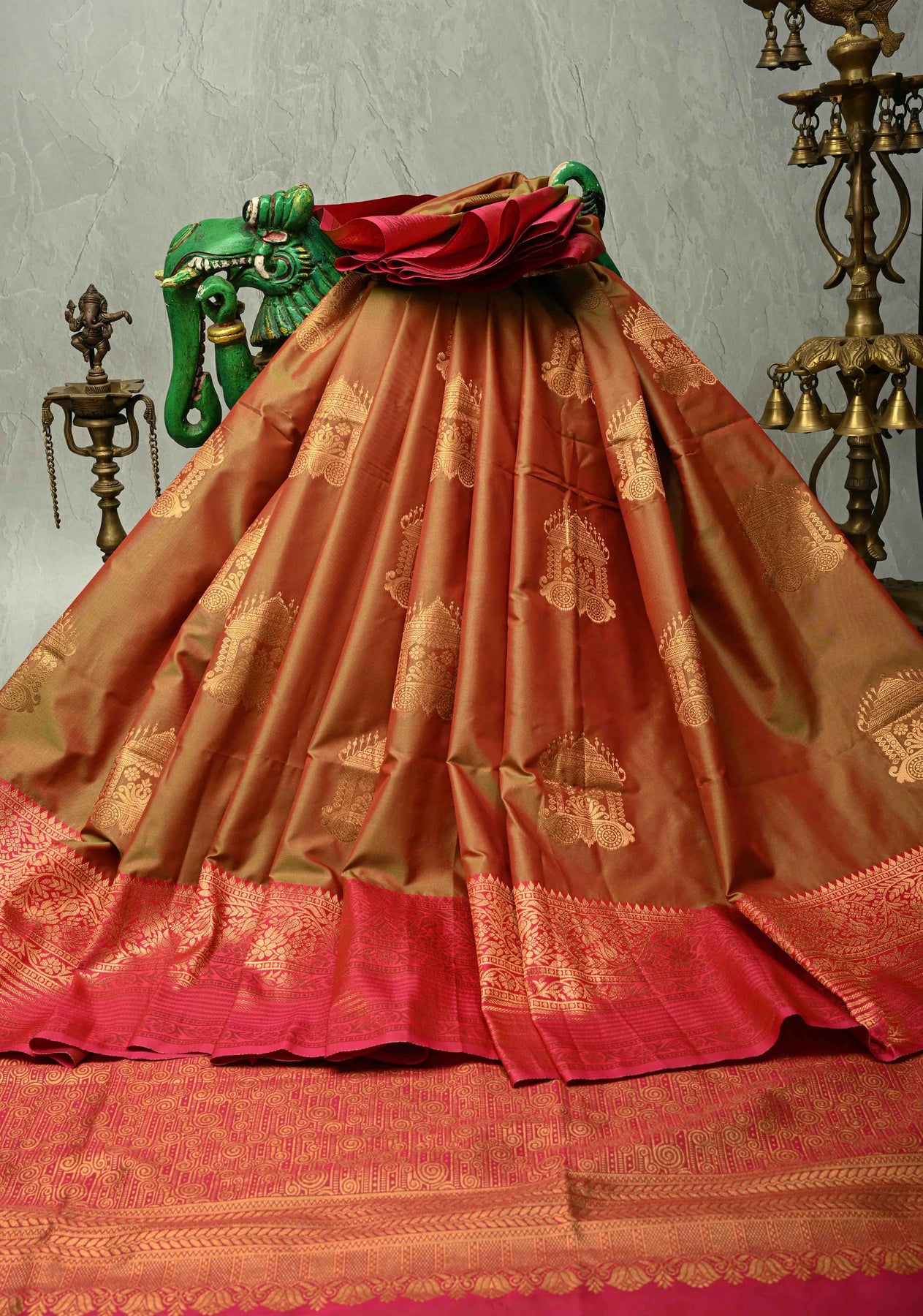 Celebrate in the classic splendor of this beautiful Green Pink Dual Tone Kanchi Semi Silk Saree. The iconic color combination creates a mesmerizing, changing sheen, giving the saree a rich depth and vibrant contrast. The body is adorned with intricate Temple Chariot Buttas, meticulously woven in gleaming Zari, showcasing authentic South Indian craftsmanship. A bold, traditional Zari Border frames the saree perfectly, offering the luxurious look and feel of a Kanjivaram at an accessible price point. This saree is a perfect, auspicious choice for festivals, weddings, and traditional family events.