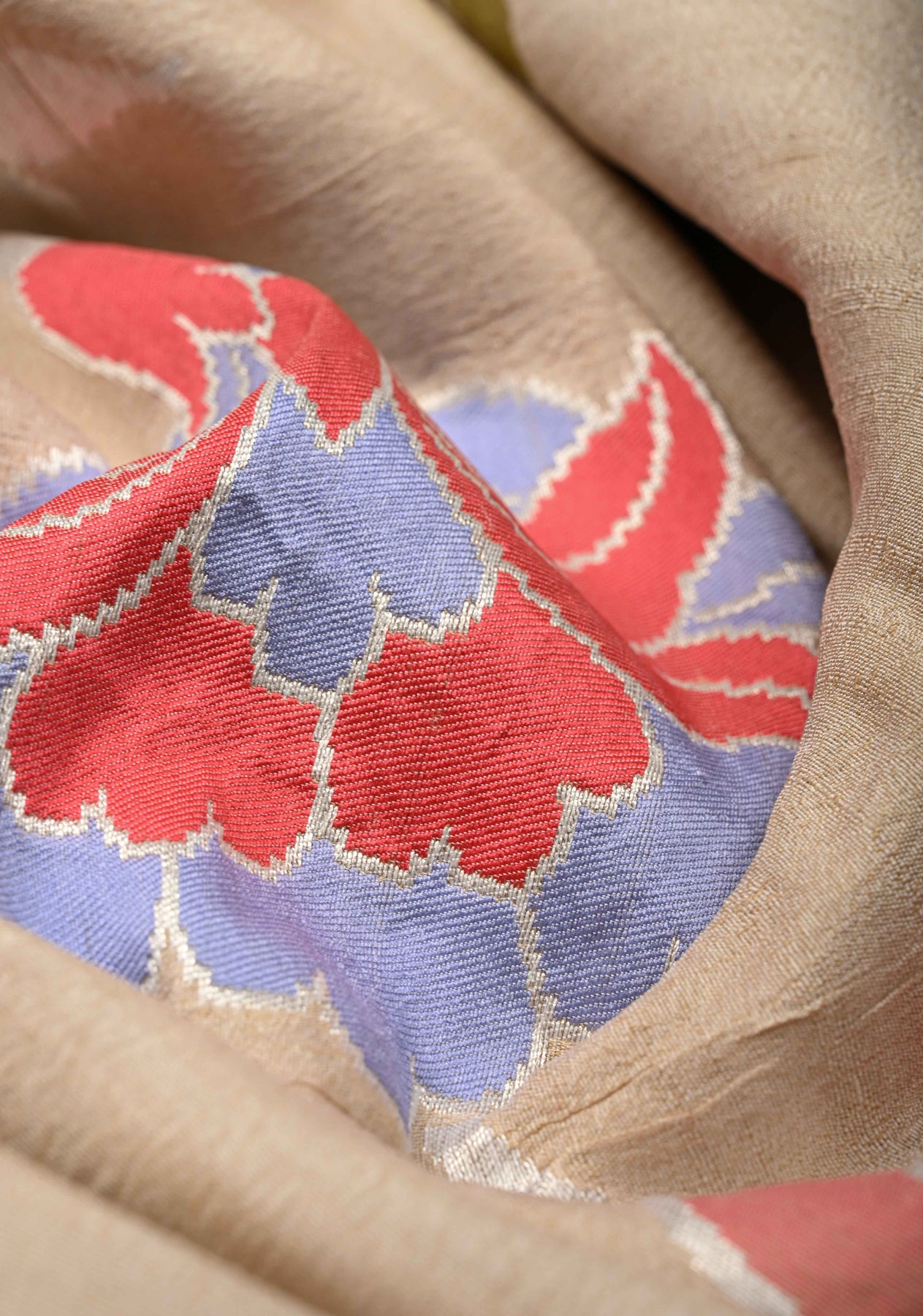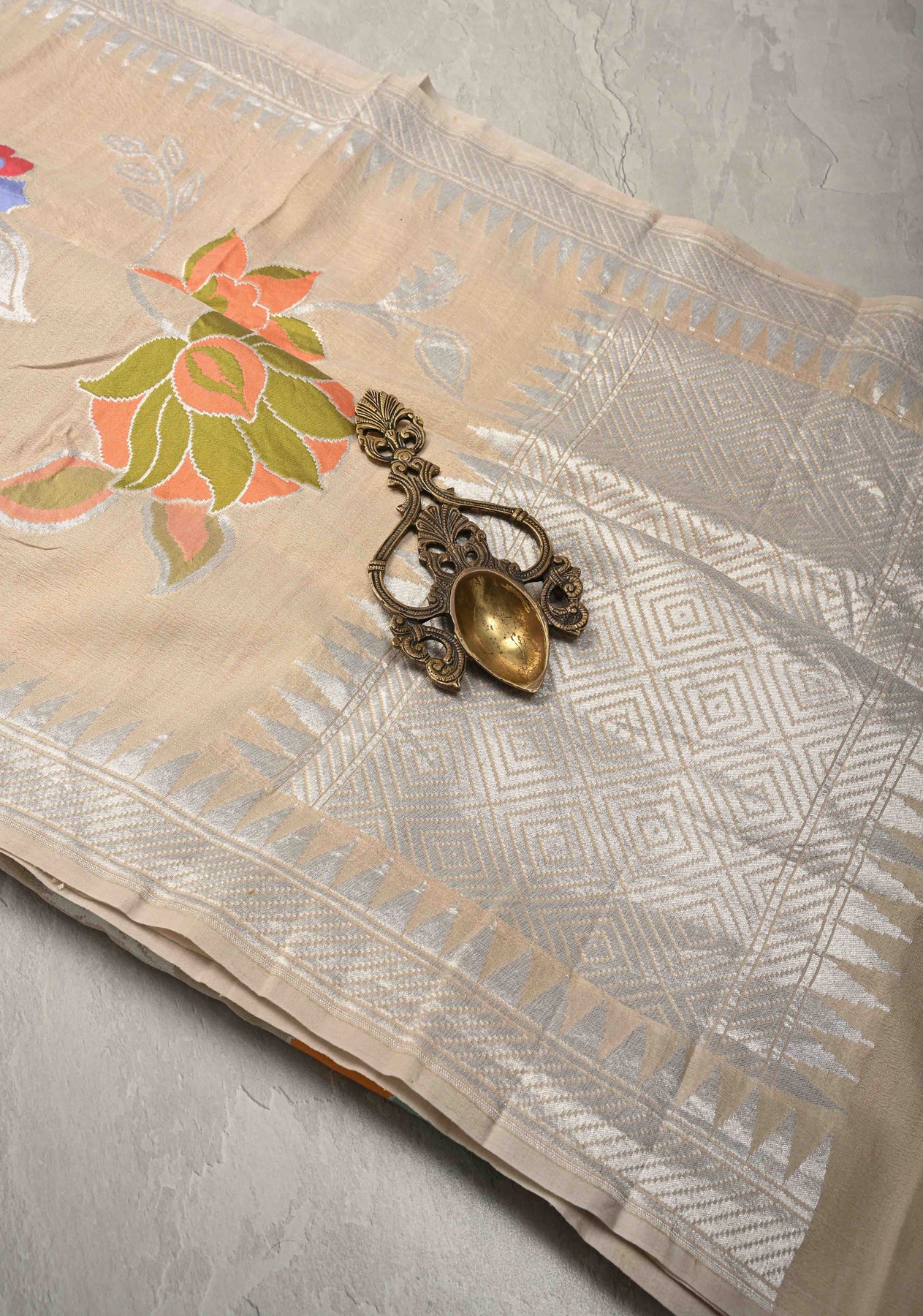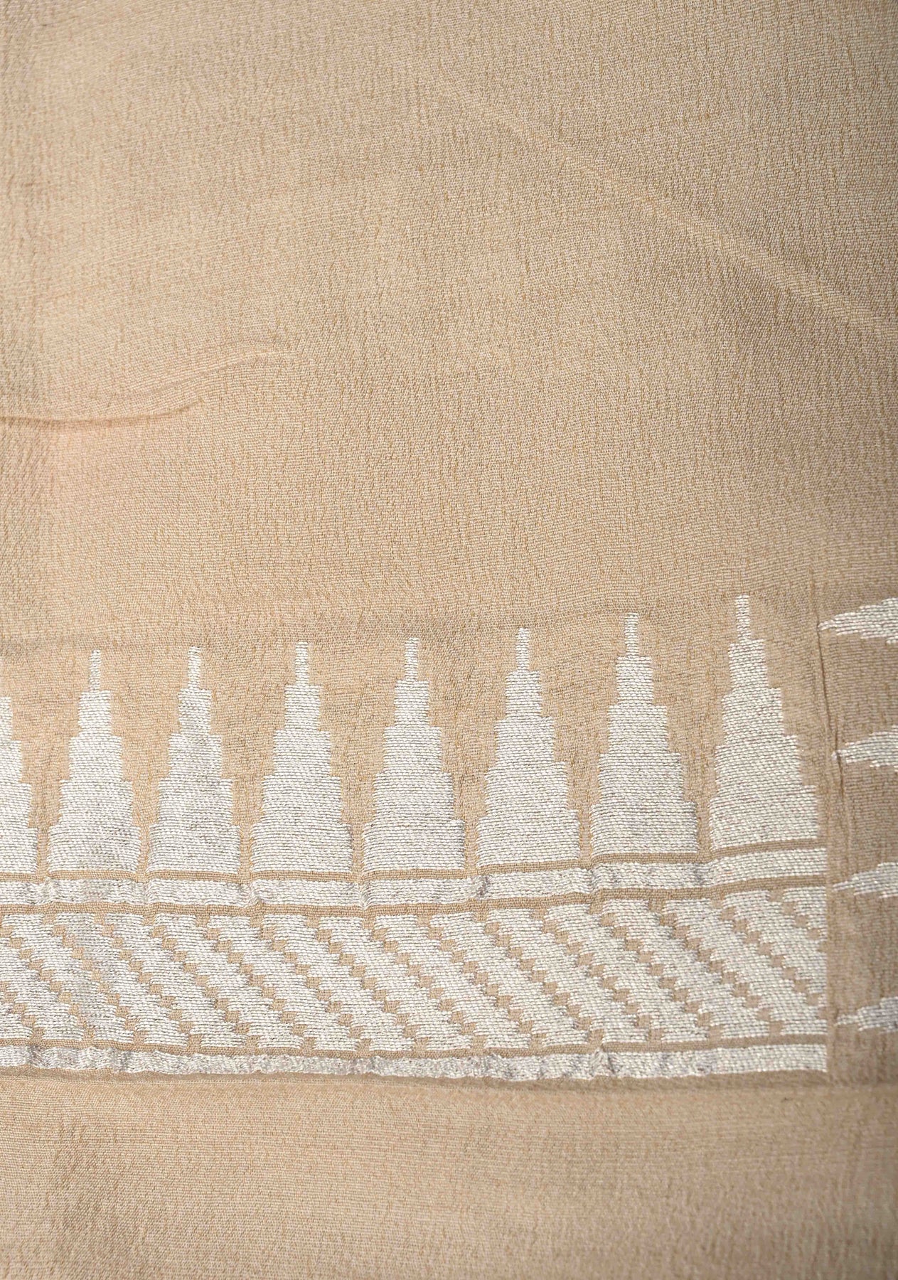 This Exquisite Cream Banarasi Tussar Georgette Saree is a graceful celebration of tradition and artistry. Crafted from a blend of tussar and georgette silk, the saree features an all-over meenakari floral jaal intricately woven with multicolored resham threads, bringing a vibrant contrast to the soft cream base. The texture is rich yet lightweight, offering an elegant drape perfect for long hours of wear. A stunning zari temple border frames the saree, adding depth and a touch of heritage grandeur. Ideal for weddings, festive gatherings, and cultural events, this saree strikes the perfect balance between subtlety and splendor.
