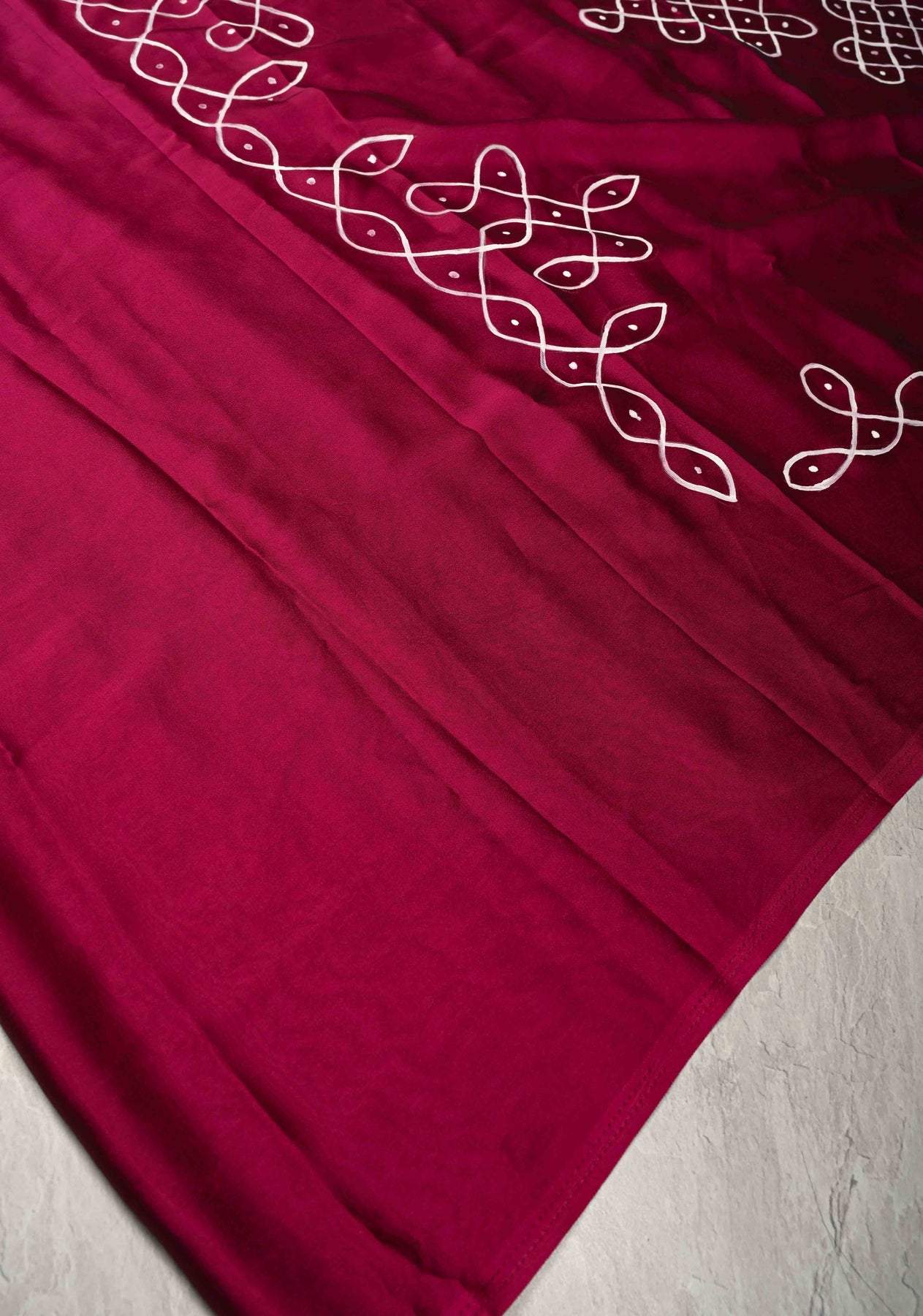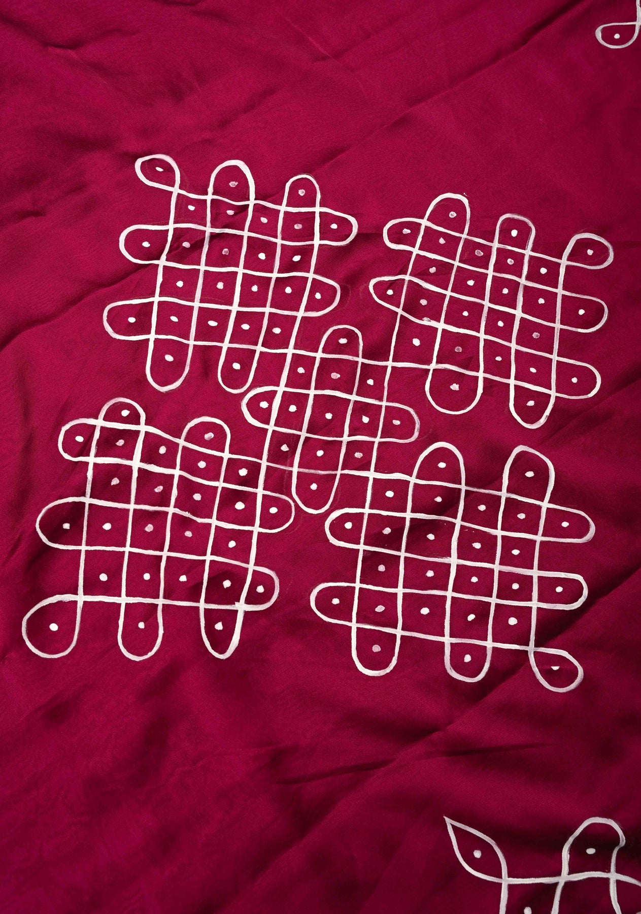 Celebrate vibrant tradition with this stunning Magenta Georgette Saree, beautifully adorned with intricate hand-painted Rangoli designs on the pallu. Crafted from lightweight, flowing georgette fabric, it offers graceful draping and all-day comfort. The detailed Rangoli artwork adds a festive and cultural touch, making this saree an ideal choice for celebrations, festivals, and special occasions. Pair it with simple jewelry to highlight the artistic charm and create a striking ethnic ensemble.