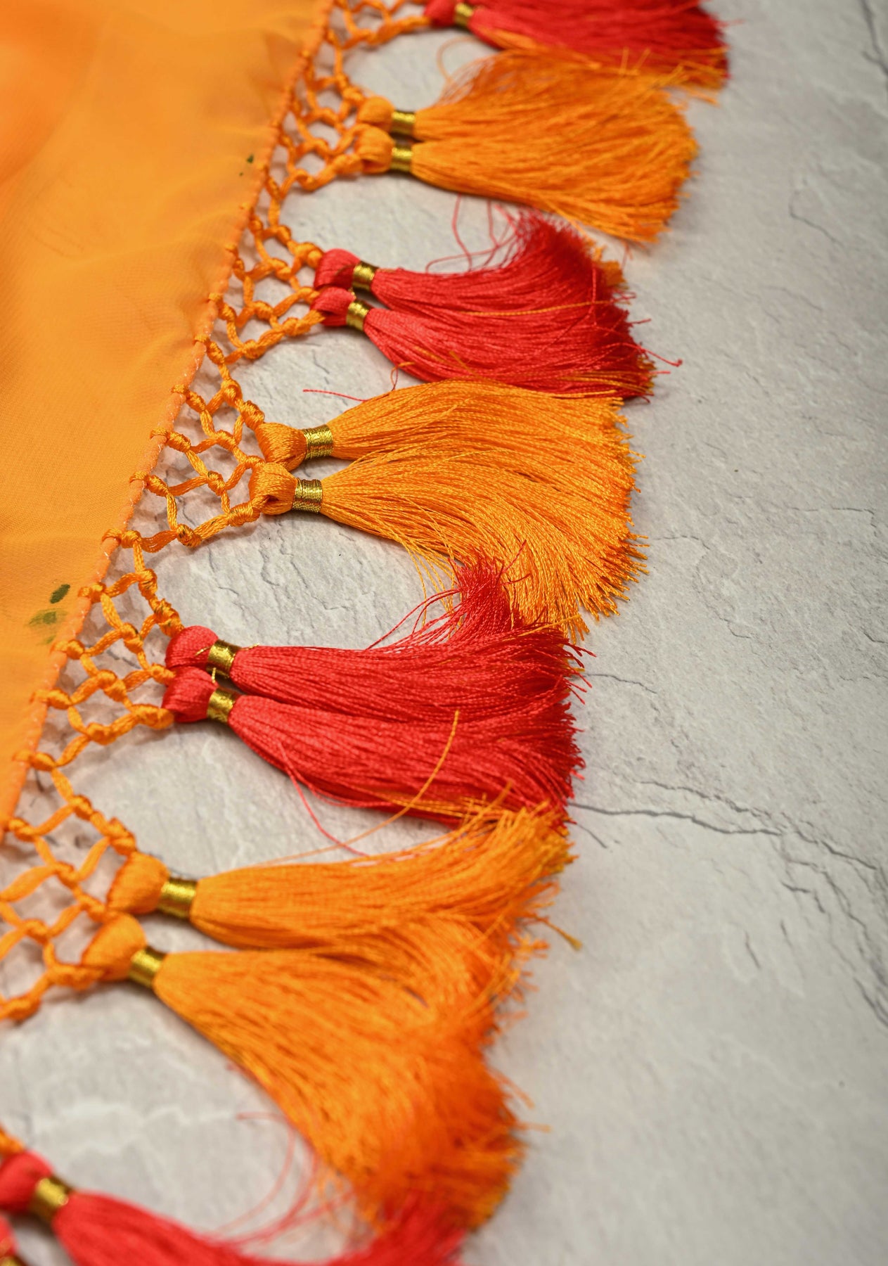This saree is ready to wear with fall and pico done. Handmade silk tassels adorn the pallu and add more grace to it.