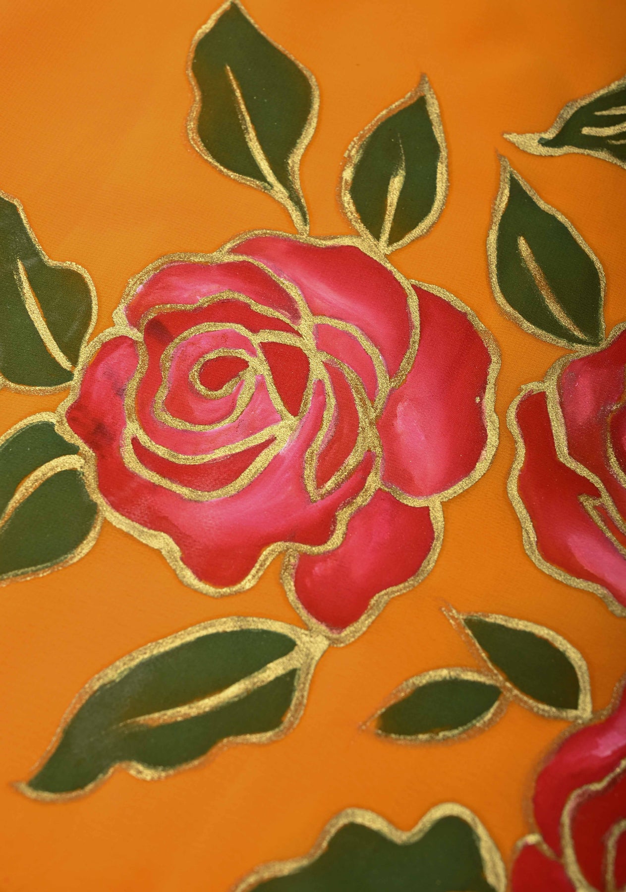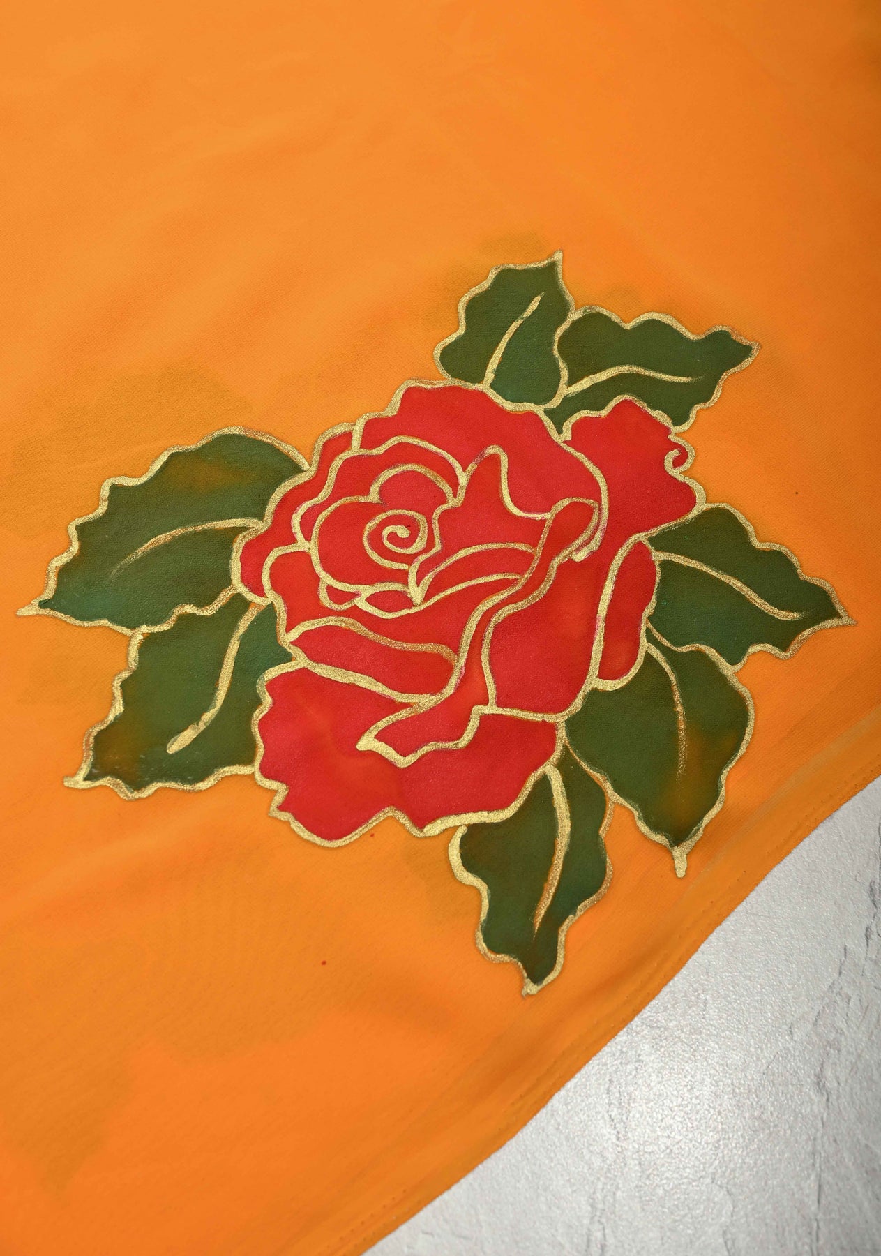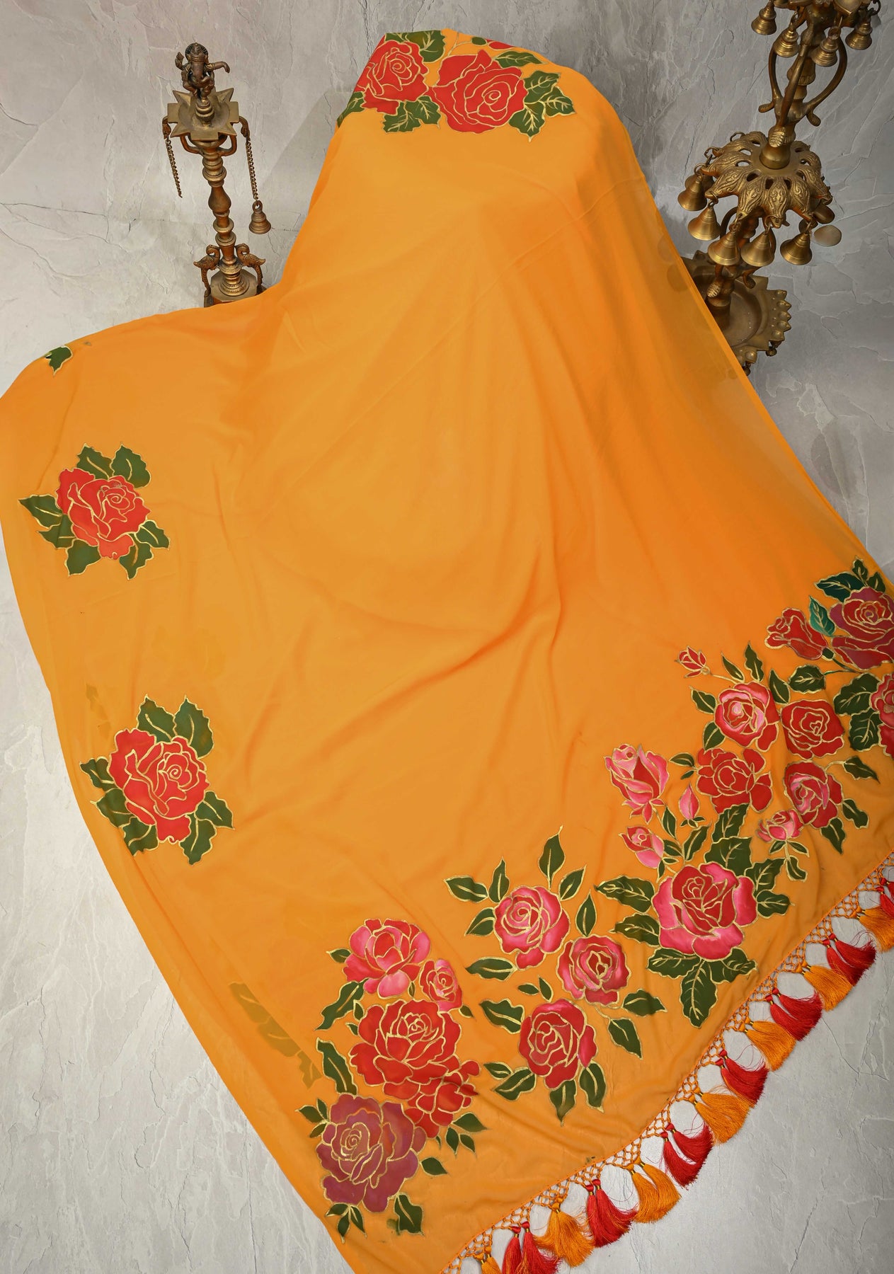 Brighten your ethnic wardrobe with this Mustard Yellow Georgette Saree, beautifully enhanced with blooming rose hand-painted artwork that adds a touch of timeless romance. Crafted from flowy georgette, the saree drapes effortlessly, offering fluid movement and comfort. The hand-painted rose motifs lend an artistic, handcrafted charm, making this saree a perfect choice for festive occasions, cultural gatherings, and elegant day or evening wear. Pair it with subtle accessories to highlight the delicate artwork.