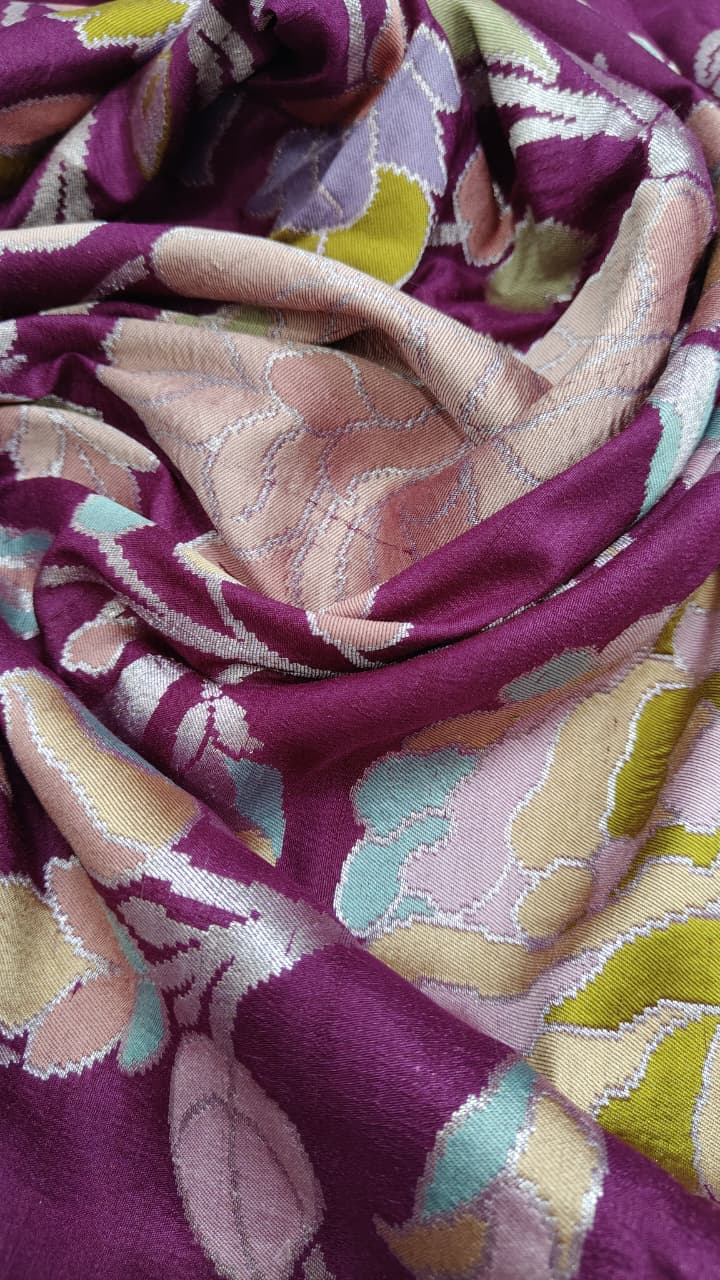 The saree is adorned with an intricate Meenakari floral jaal, featuring delicate multicolored threadwork that brings depth and vibrance to the deep plum base. The floral motifs add a touch of heritage charm, making it perfect for festive and formal occasions.