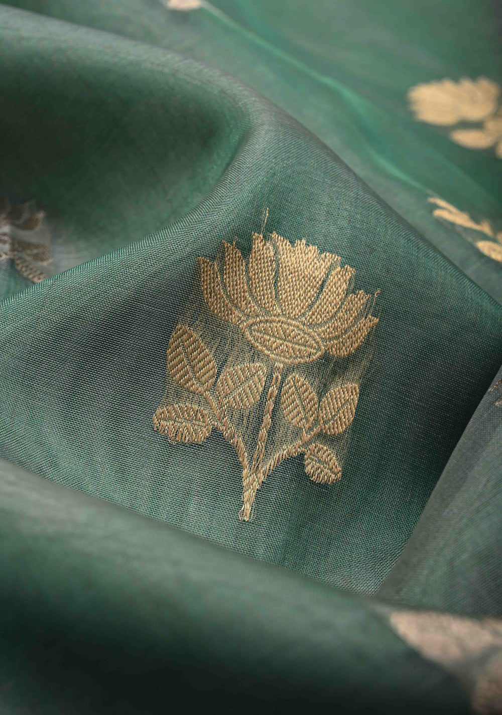 The motifs often include temple shapes, flowers, and mango patterns, which symbolize tradition and prosperity.