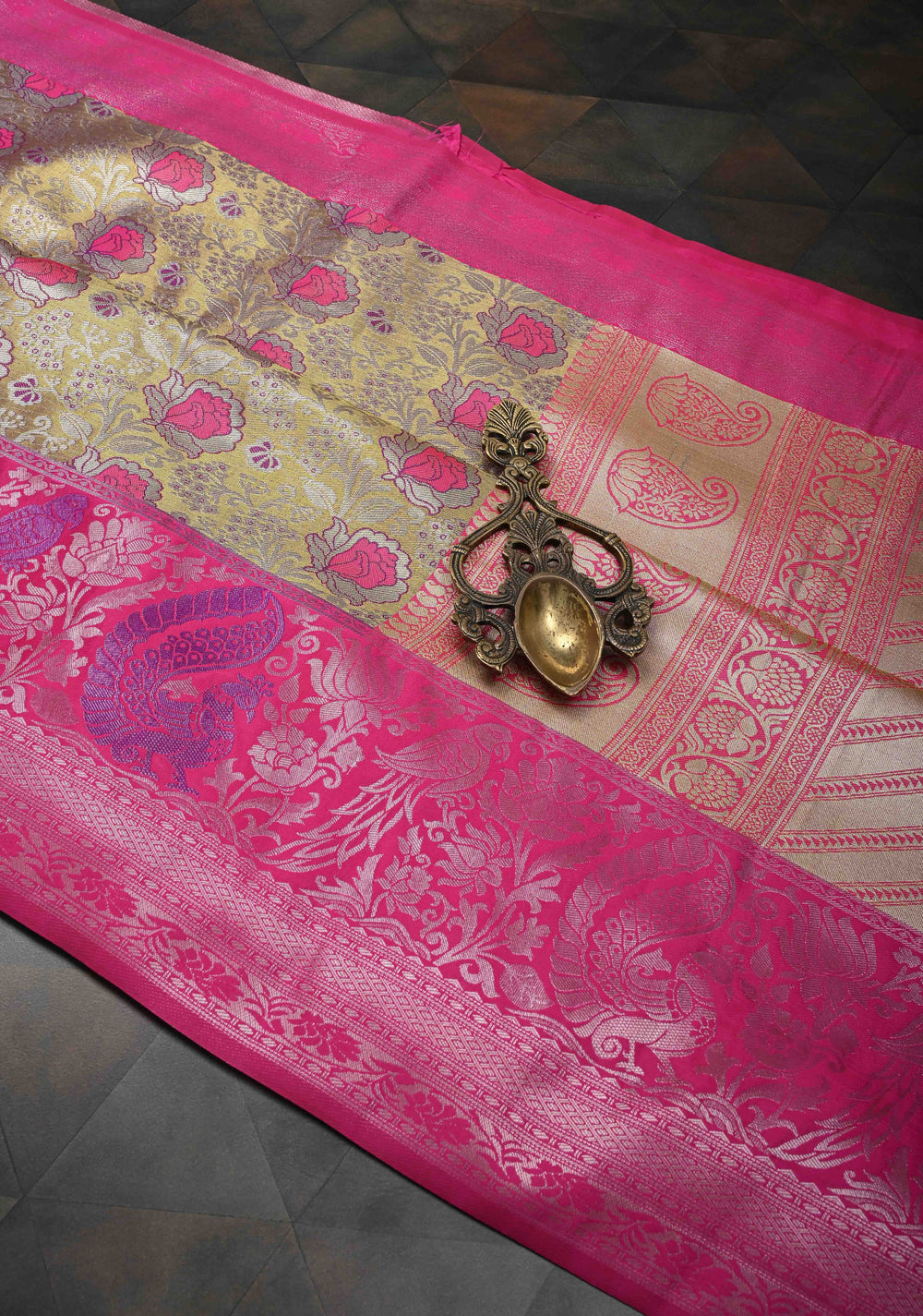 Banarasi sarees are decorated with beautiful golden patterns, often inspired by Mughal art like floral vines, leaves, and intricate paisley designs.