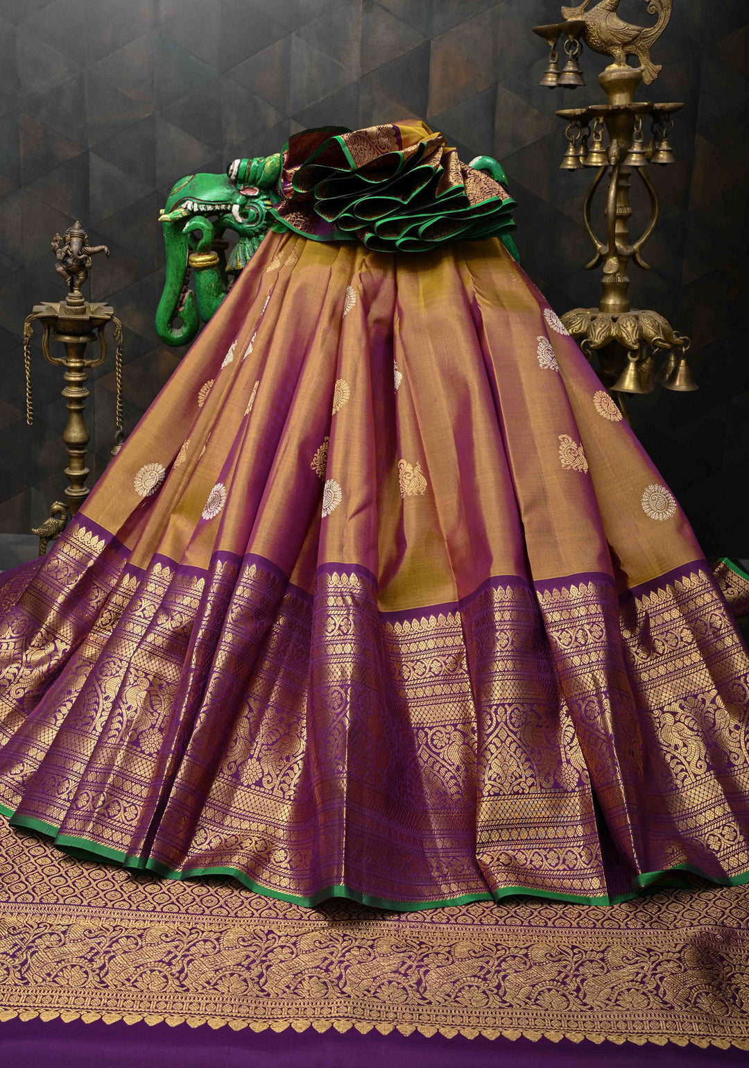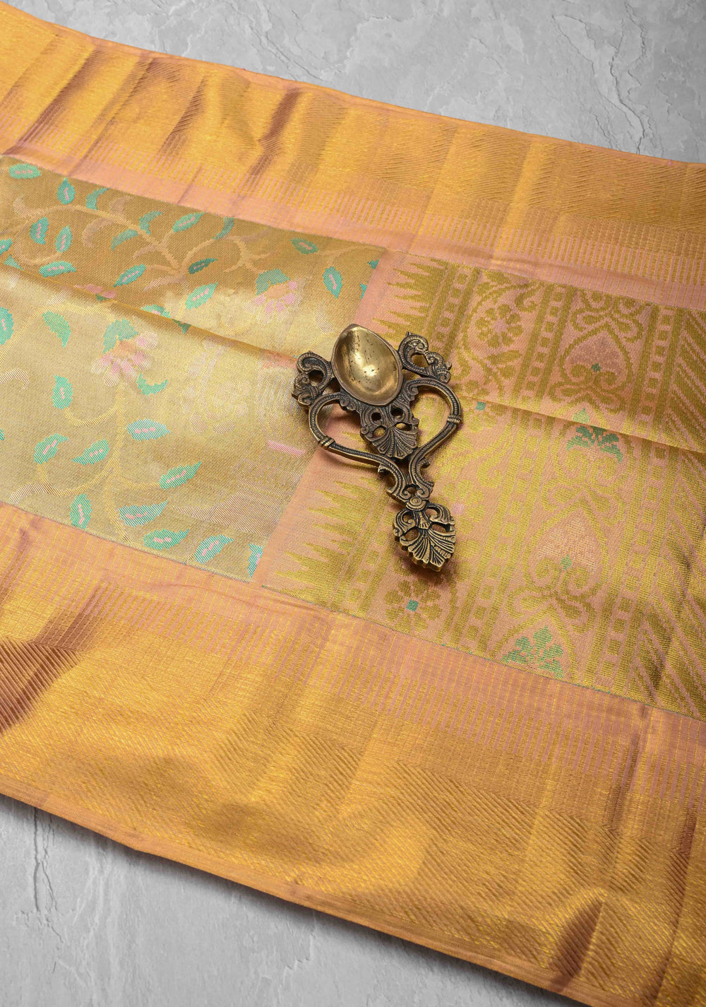 The golden saree family is like a beautiful story from all over India. Each saree has its own unique design and tells a special tale. Let me explain to you in simple words based on their motifs and designs: