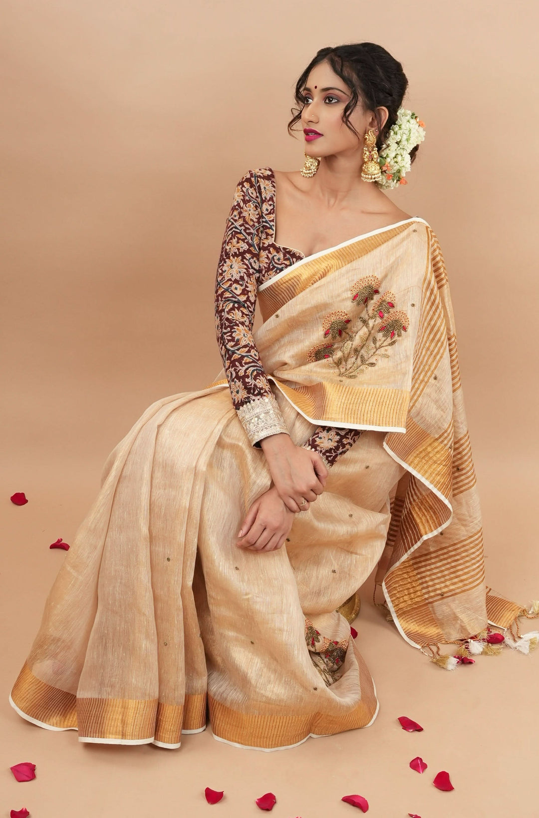 For a golden saree, fabrics like silk, velvet, or brocade work wonders for a traditional look.