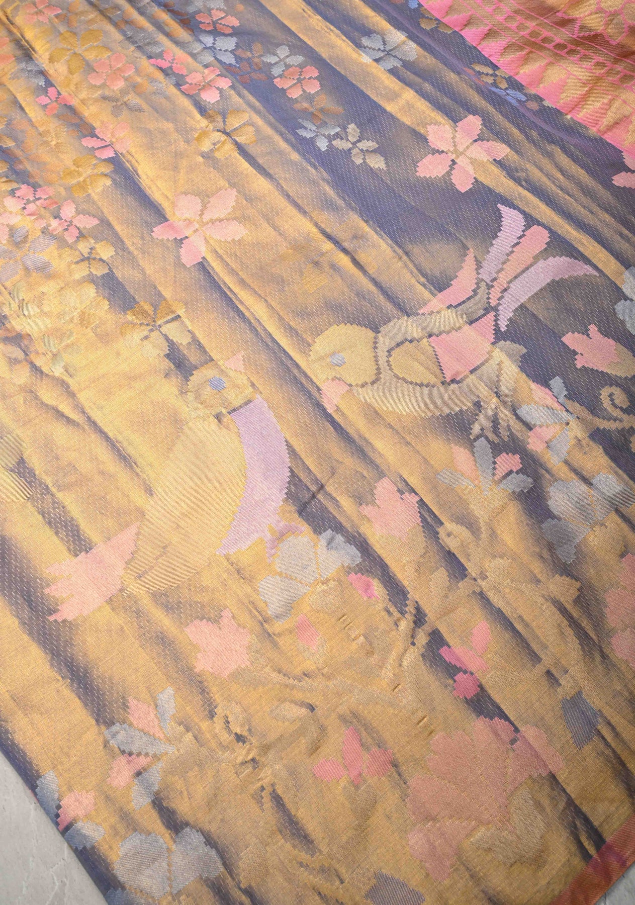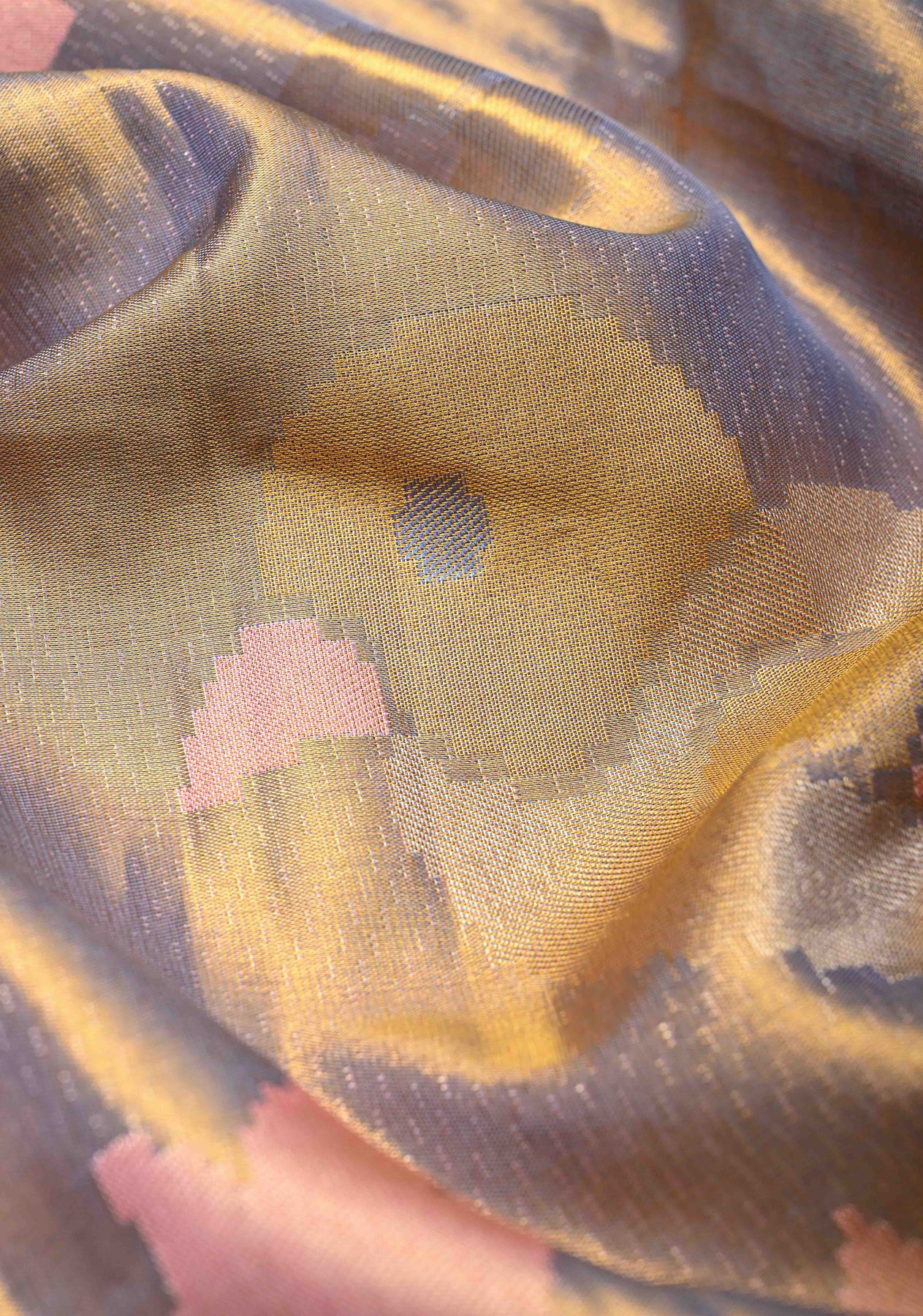 Grace meets grandeur in this Gold-Blue Borderless Tissue Kanjivaram Pure Silk Saree, a stunning showcase of traditional artistry and modern elegance. Crafted from pure silk with a lustrous tissue finish, the saree features a mesmerizing interplay of gold and blue tones that shimmer with every movement. Intricately woven Meenakari floral motifs in vibrant hues add a burst of color and detail, enhancing the saree's luxurious appeal. The borderless design lends a contemporary touch, making it a perfect choice for those who appreciate subtle sophistication. Ideal for weddings, festive occasions, and evening events, this saree is both graceful and timeless.